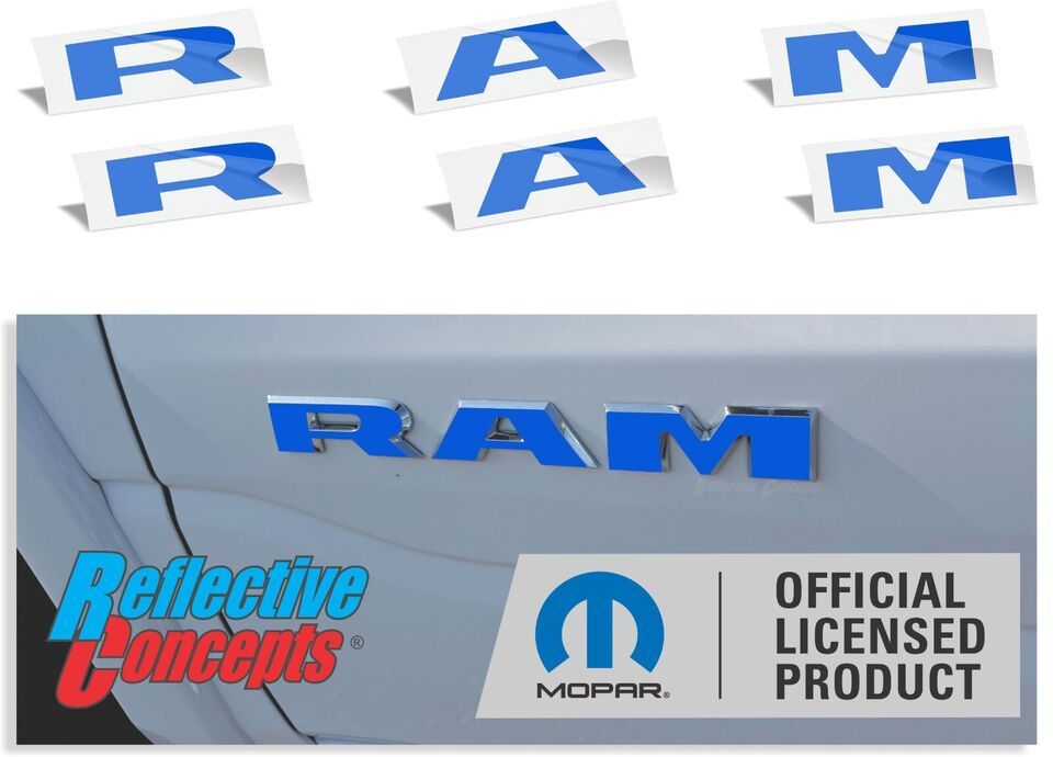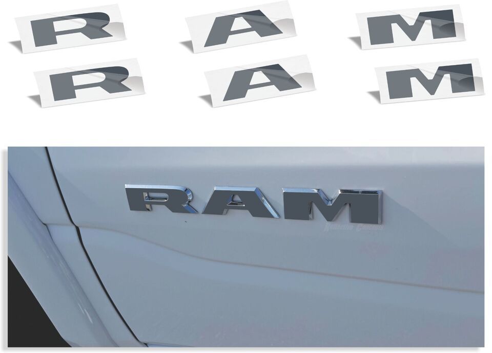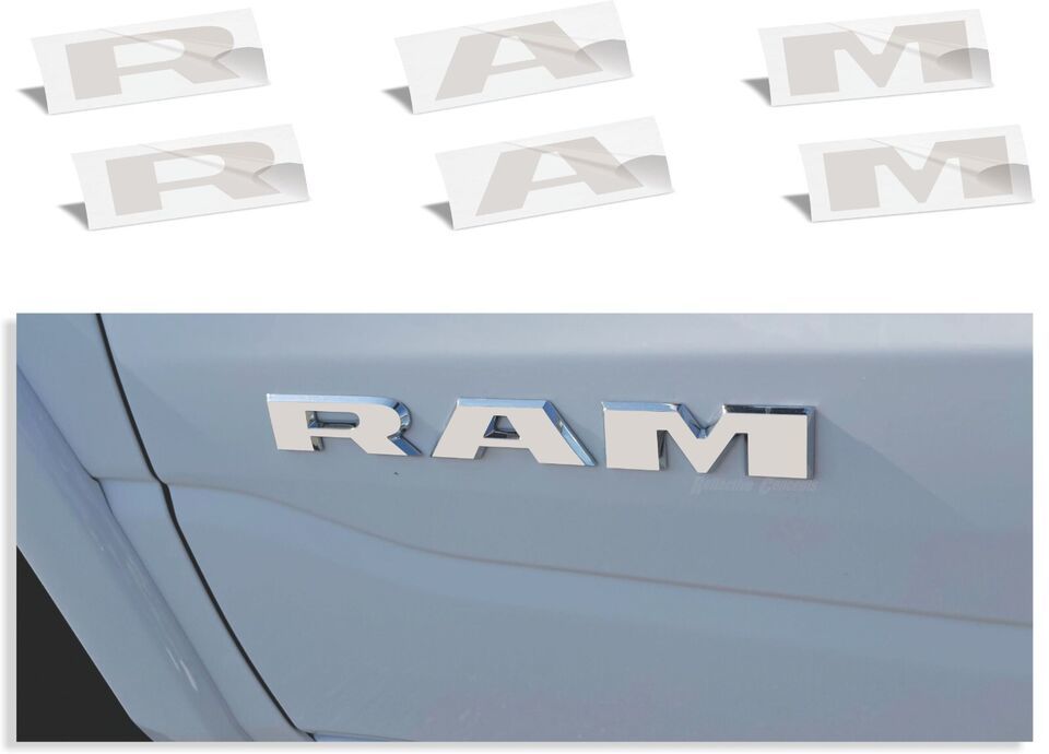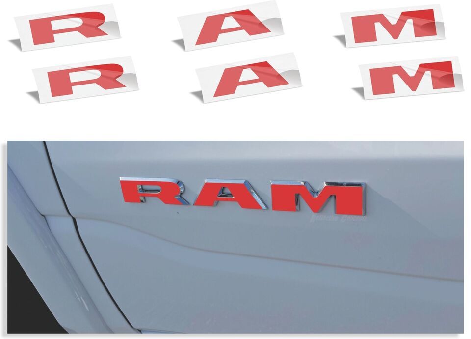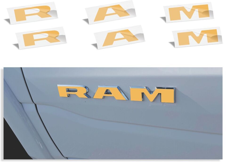 Decals (stickers) sized designed to be applied to the face of the existing RAM emblems on the doors. The beveled outer edge will remain exposed.