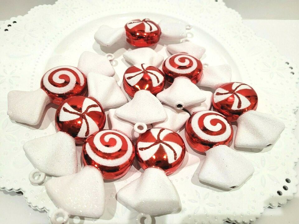 Up for sale we have a set of 8 adorable peppermint candy ornaments for your Christmas tree, Wreath or Garland. These ornaments are so cute they are red with white glitter. These measure approx 4.25" including the round tip. These are new but will not come in original box to be able to ship in a smaller box and keep shipping cost down. Please note some of these might has some slight imperfection on the ornaments.