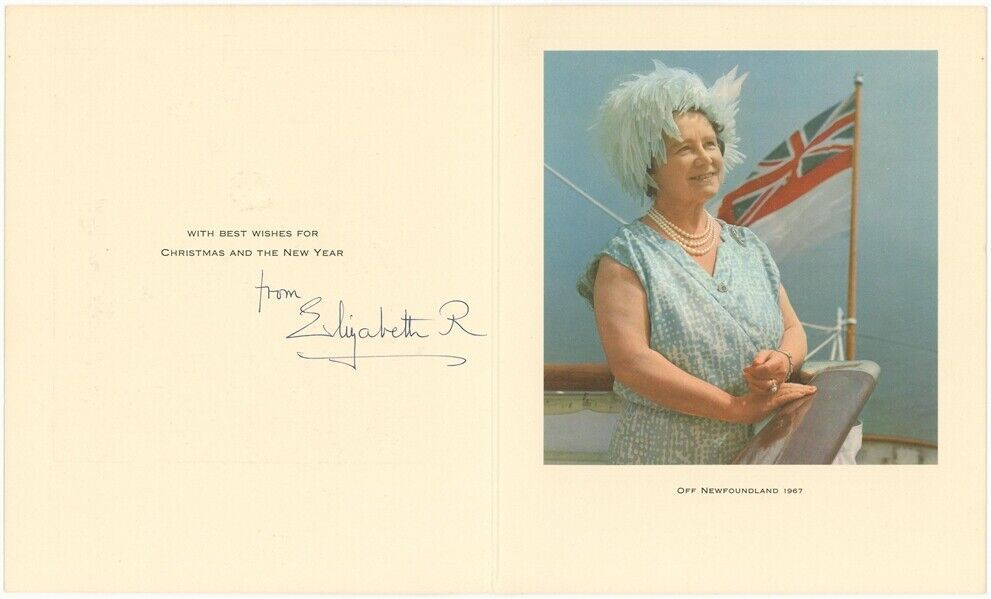 Offered is a 1967 Queen Mother signed Christmas card with a photograph of the monarch off the coast of Newfoundland.