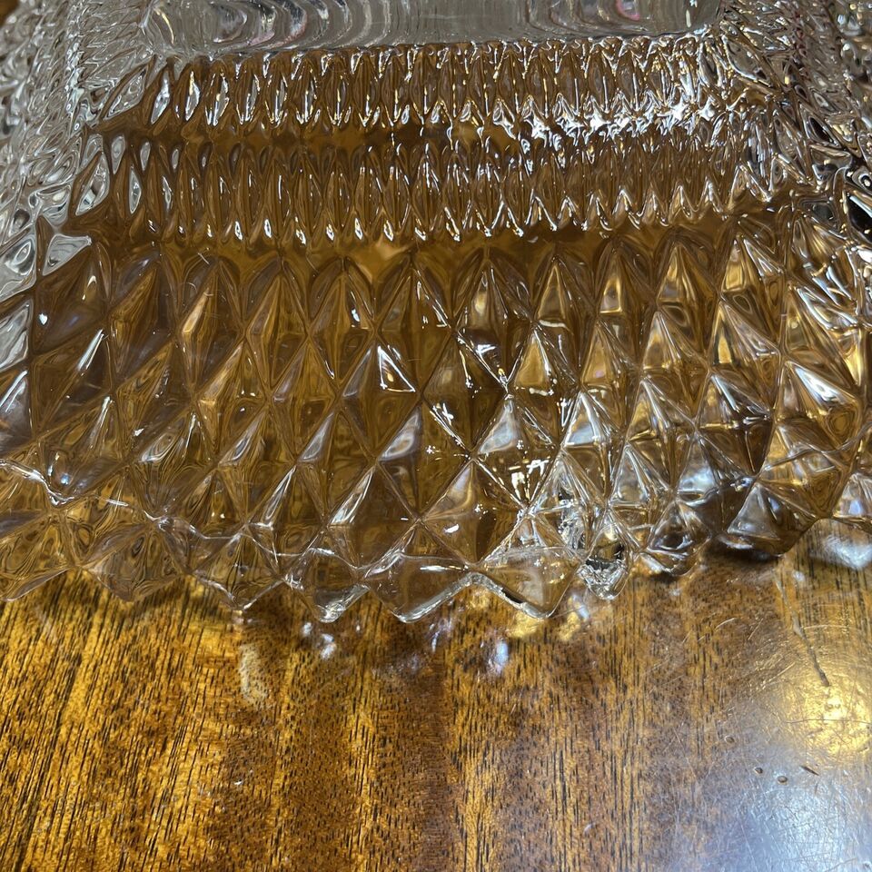 This vintage candy dish is a charming addition to any collection. The Westmoreland English Hobnail pattern adds an elegant touch to the clear glass. Measuring 7 inches, it is the perfect size for displaying candies or other small treats. This vintage original is a square shape and features a ruffled edge for a unique touch. The production style is elegant glass and the manufacturer is Westmoreland. The dish is perfect for collectors of vintage glassware or those who appreciate the beauty of English Hobnail pattern.