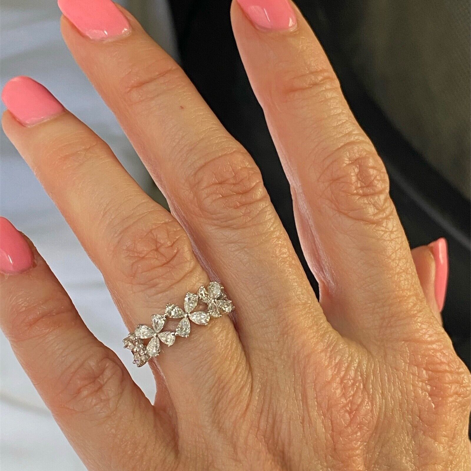 This elegant wedding band is a celebration of timeless beauty and modern craftsmanship. Featuring pear brilliant cut lab-grown diamonds arranged in a delicate 4-petal floral design, this band creates a unique 5 X pattern that symbolizes unity and everlasting love.