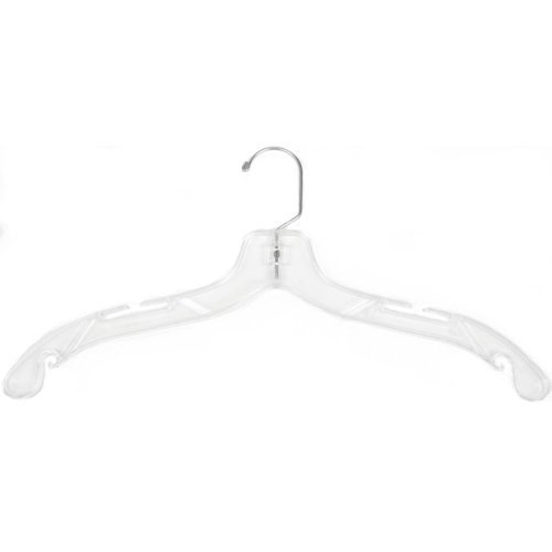 Product description: Keep your closet in order with these clear plastic shirt hangers. Measuring 17 inches in length, they are perfect for organizing all types of tops and dresses. Each pack contains 100 hangers, making it perfect for retailers or those looking to streamline their wardrobe. - The swivel chrome hook ensures these hangers will fit perfectly on any closet rod, while the notched shoulders keep dresses with straps securely in place. No more worrying about items falling off the hanger! These hangers will keep your clothes organized and wrinkle-free. - Made from durable and high-quality plastic, these shirt top hangers are built to last. Say goodbye to flimsy and easily broken hangers - our clear plastic design is strong enough to hold heavier items without breaking or bending. Perfect for everyday use or storing seasonal clothing. - These clear plastic hangers also add a sleek and modern touch to any closet. Their transparent design allows your clothes to be the star of the show, while still keeping everything neat and tidy. Don't settle for boring and bulky hangers - upgrade to our clear plastic shirt top hangers today!