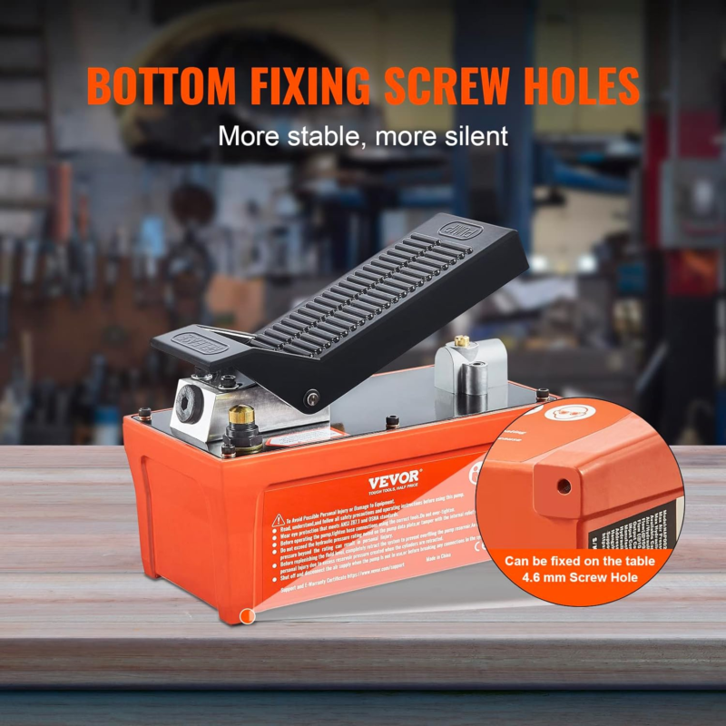 Non-slip and Shock-proof: With two fixing screw holes located at the bottom, the foot actuated hydraulic pump can be securely positioned, minimizing sliding and vibration during operation. This results in a quieter working environment, providing you with a more comfortable experience.