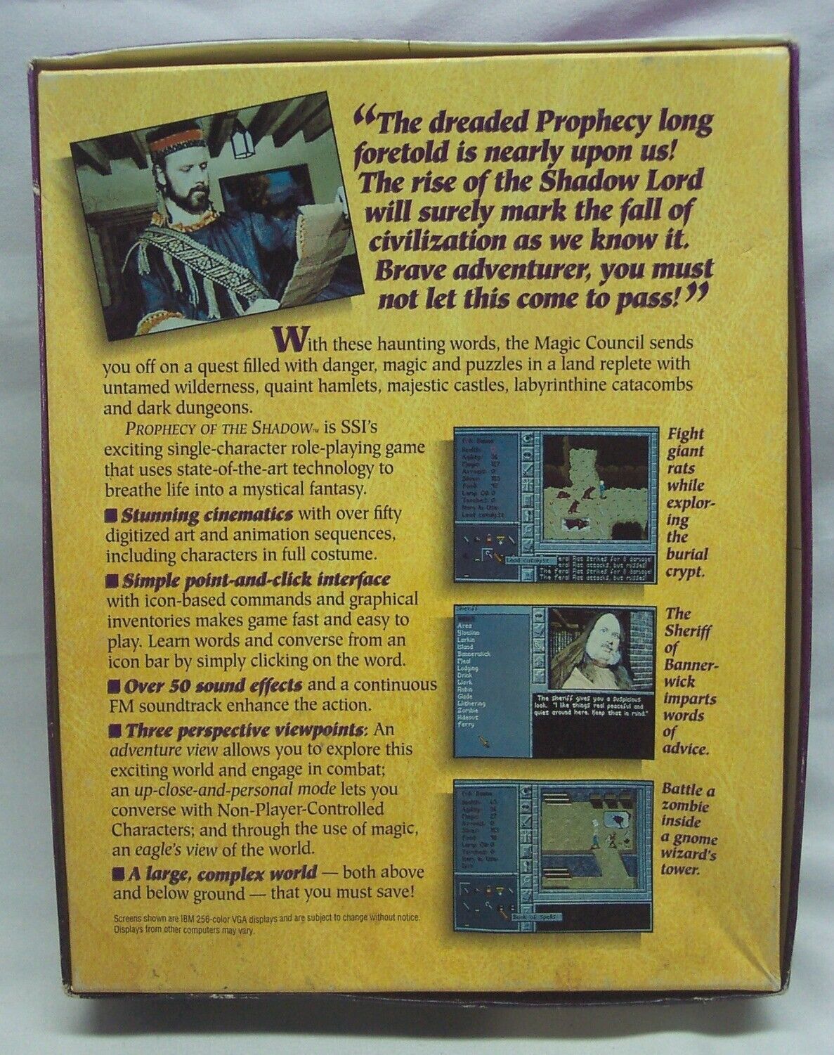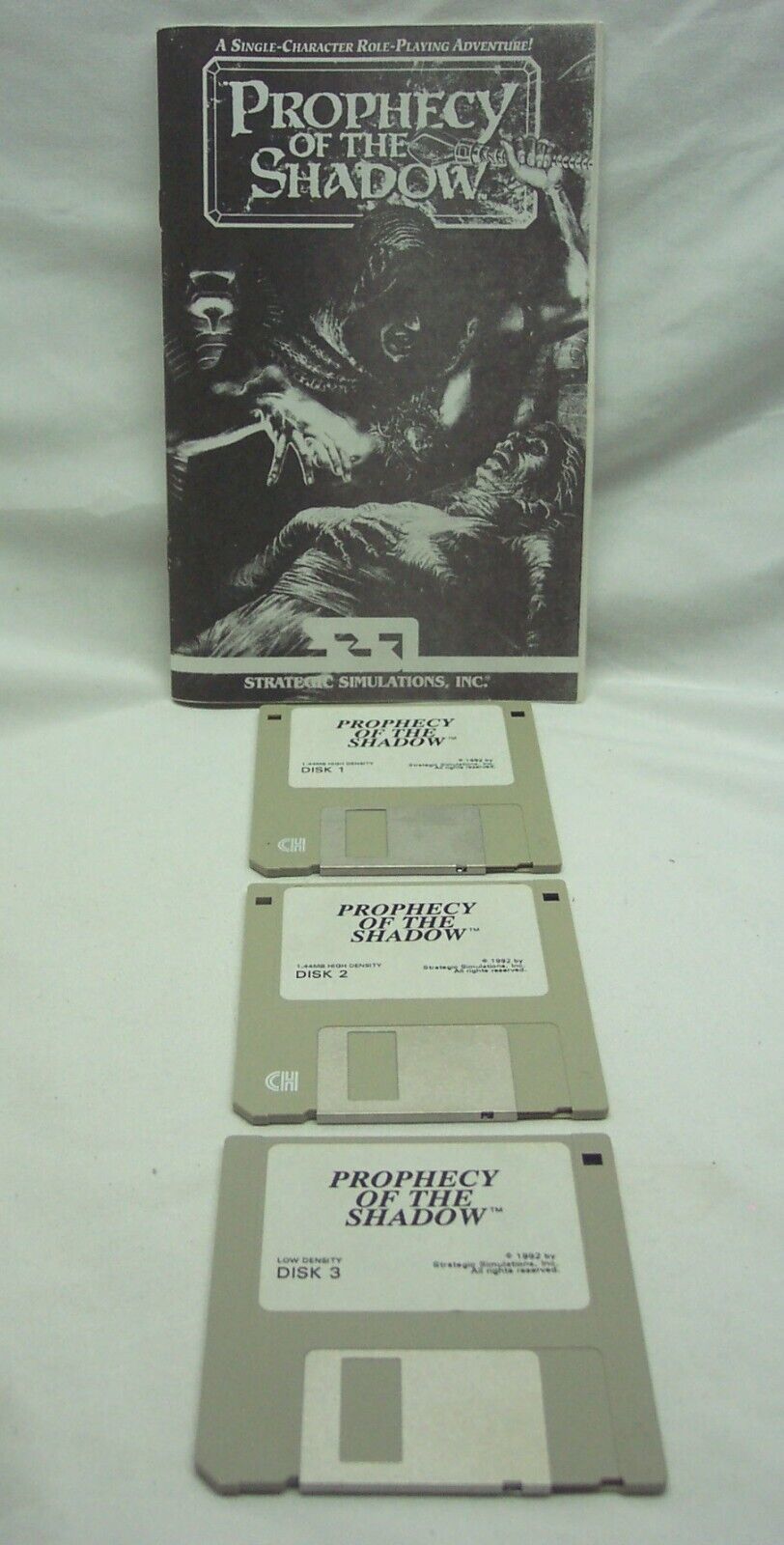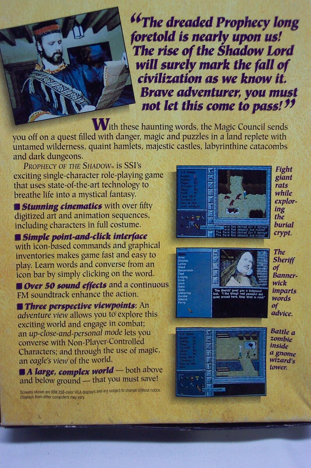 This is a Vintage SSI Prophecy of the Shadow PC Role Playing Computer Video Game from 1992. Made by Strategic Simulations. Inc. Single Player Role Playing Adventure. 3.5" Floppy Disc. It is complete with the manual. The box has some general wear from use. Combine auctions to save on shipping. ELAG