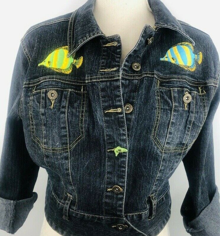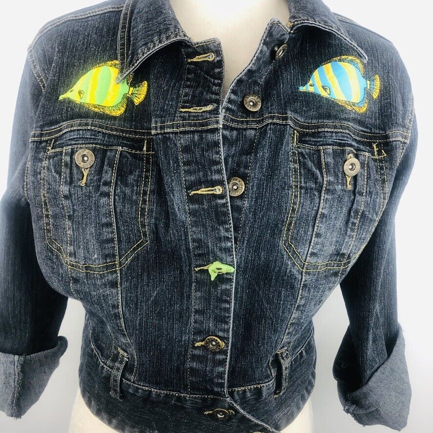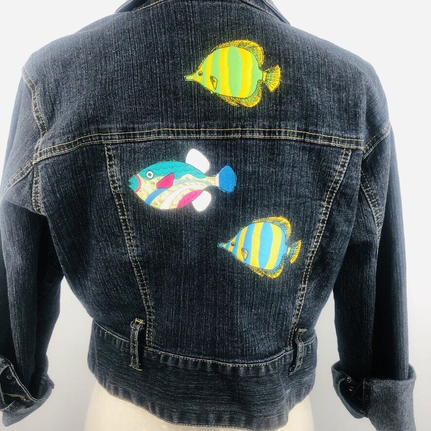 Ashley Stewart Blue Denim Jean Jacket Upcycled Fish Embellished Size 14