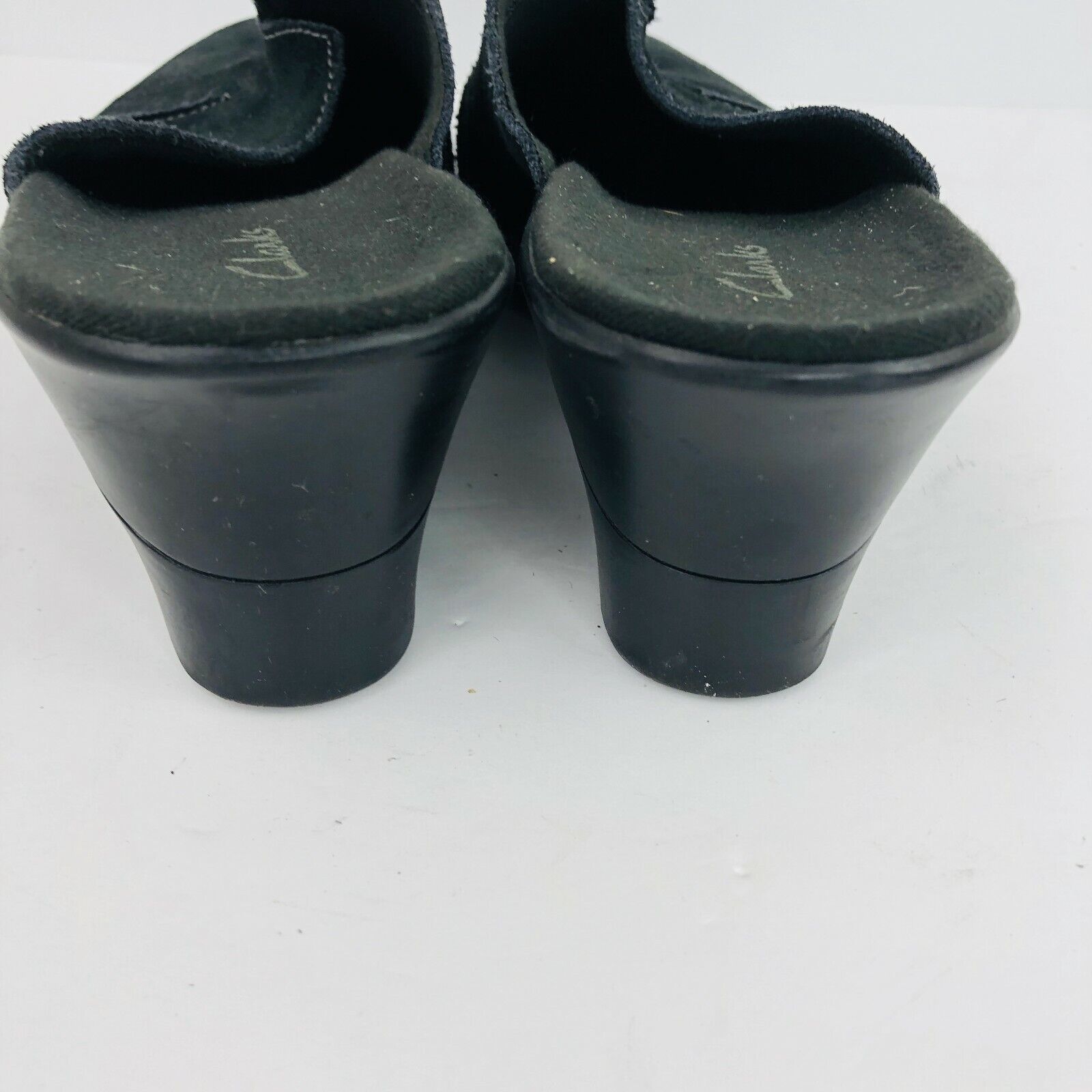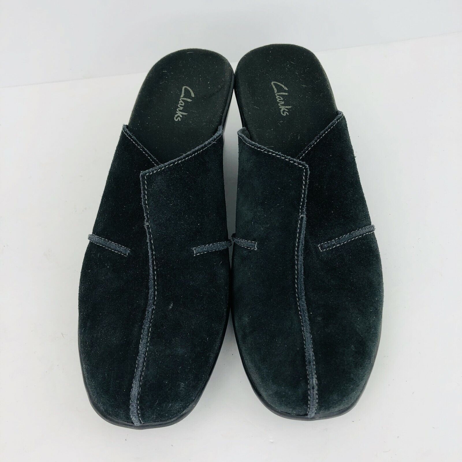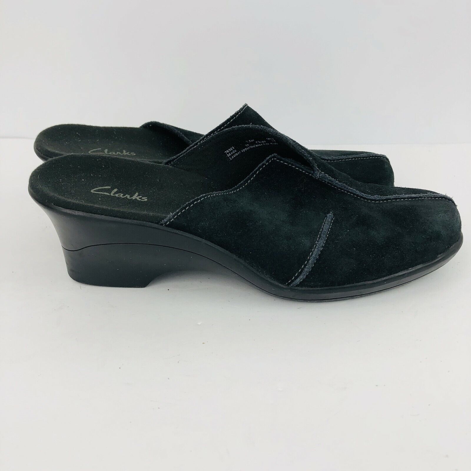 Clarks Black Suede Leather 7.5 Slip Ons Clogs Mules Wedge 78581 Delight