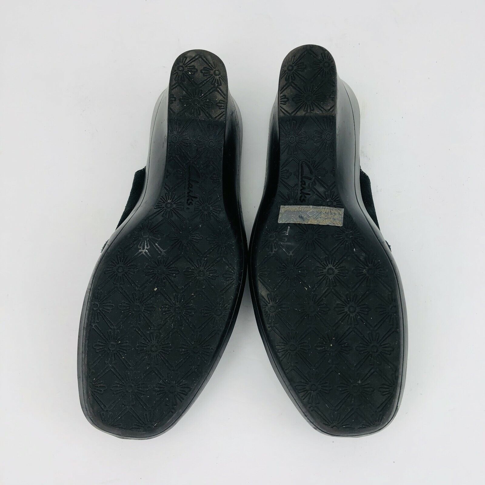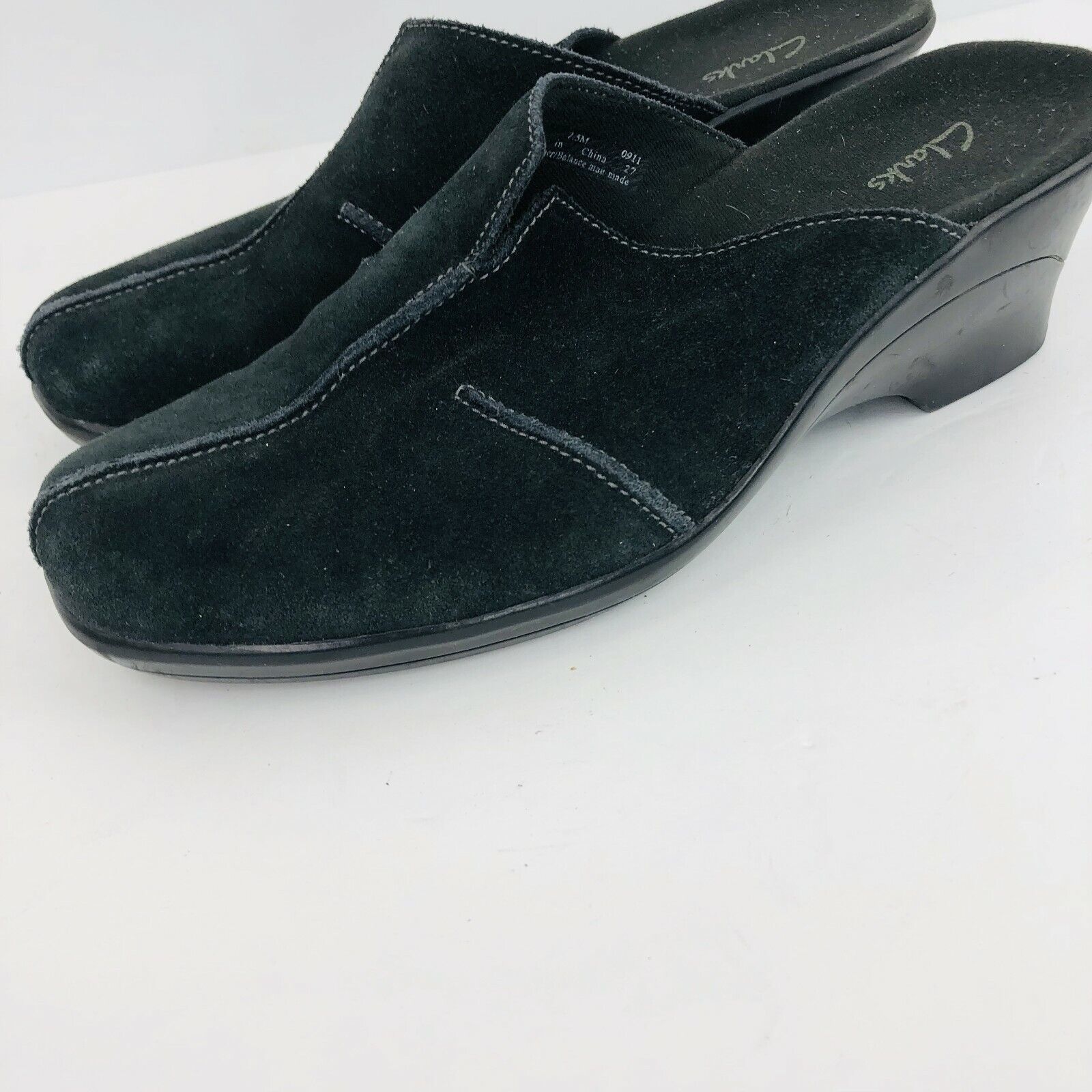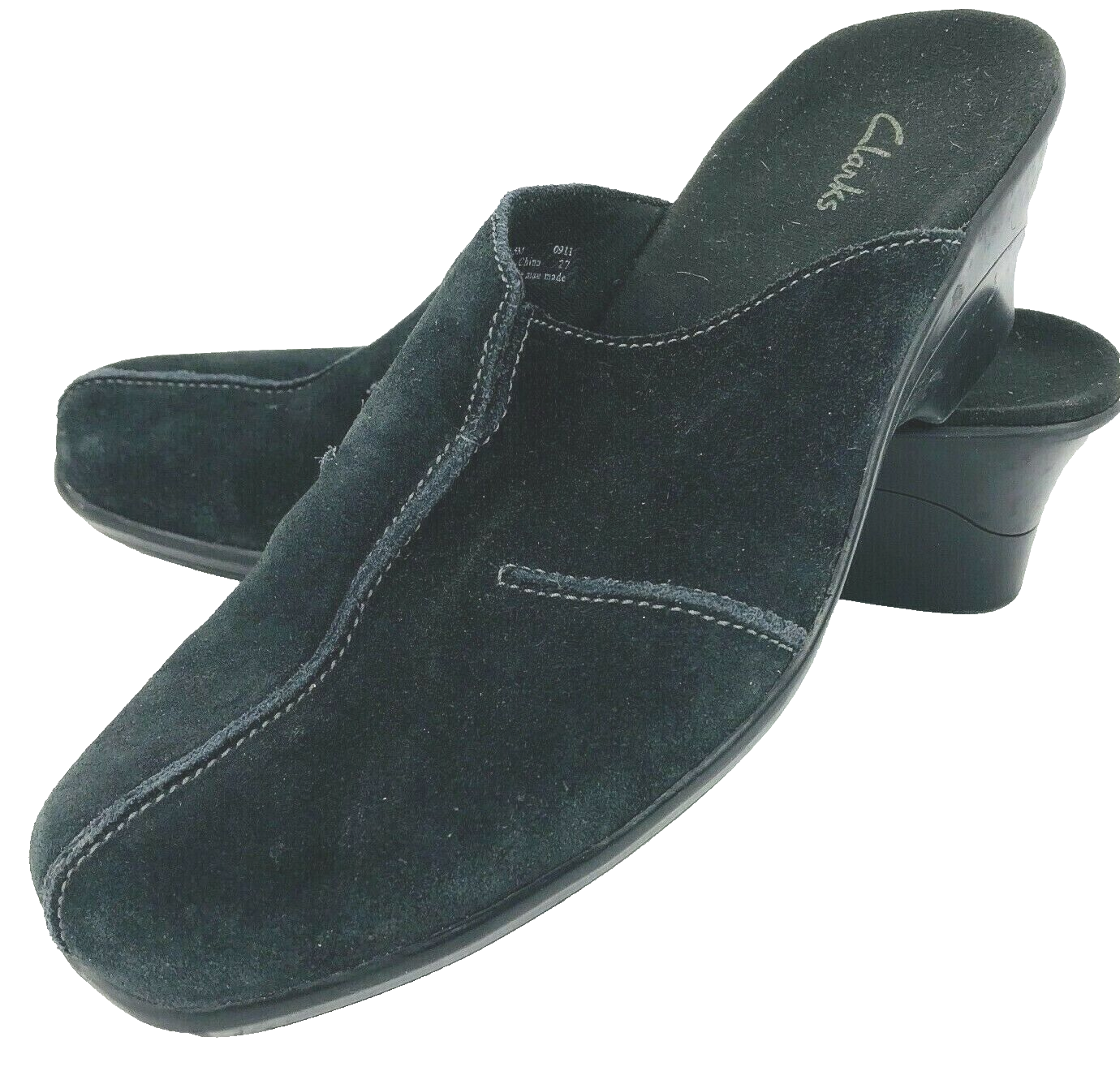 Clarks Black Suede Leather 7.5 Slip Ons Clogs Mules Wedge 78581 Delight