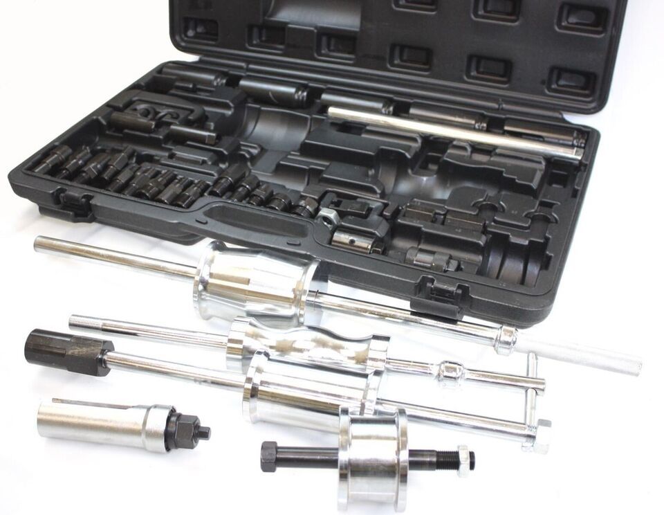DIESEL INJECTOR EXTRACTOR MASTER SET-3 Different slide hammers: 1.6 kg, 160 mm; 2.7 kg, 460 mm; 5.1 kg, 600 mm; 2 Pulling claws with fork opening: 13.7 x 18 mm, 105 mm;12.7 x 19 mm, 130 mm; 5 Slotted 6-pt 1/2" sockets, 100 mm length; sizes 25 - 27 - 28 - 29 - 30 mm; Injector extractor, sleeve design, with shells: outer diameter 35 mm; internal diameter 29 mm, M17 x 1.0 spindle; pulling adapter with external thread;