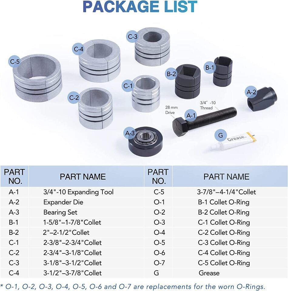 The exhaust pipe stretcher offers various collets for a broad expansion range from 1-5/8" to 4-1/4". Includes: Steel expander 1 5/8" - 2" Collet, Steel expander 2" - 2 1/2" Collet, 2 3/8"- 2 3/4" Collet, 2 3/4" - 3 1/8" Collet, 3 1/8" - 3 1/2" Collet, 3 1/2" - 3 7/8" Collet, 3 7/8" - 4 1/4" Collet.