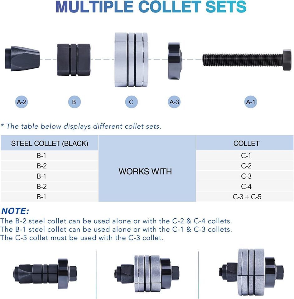 This mechanic?s tool kit provides the handy collets and expander required to stretch tailpipes before making tight seals to pipes with smaller diameters. Perfect for home DIY or professional auto shops.