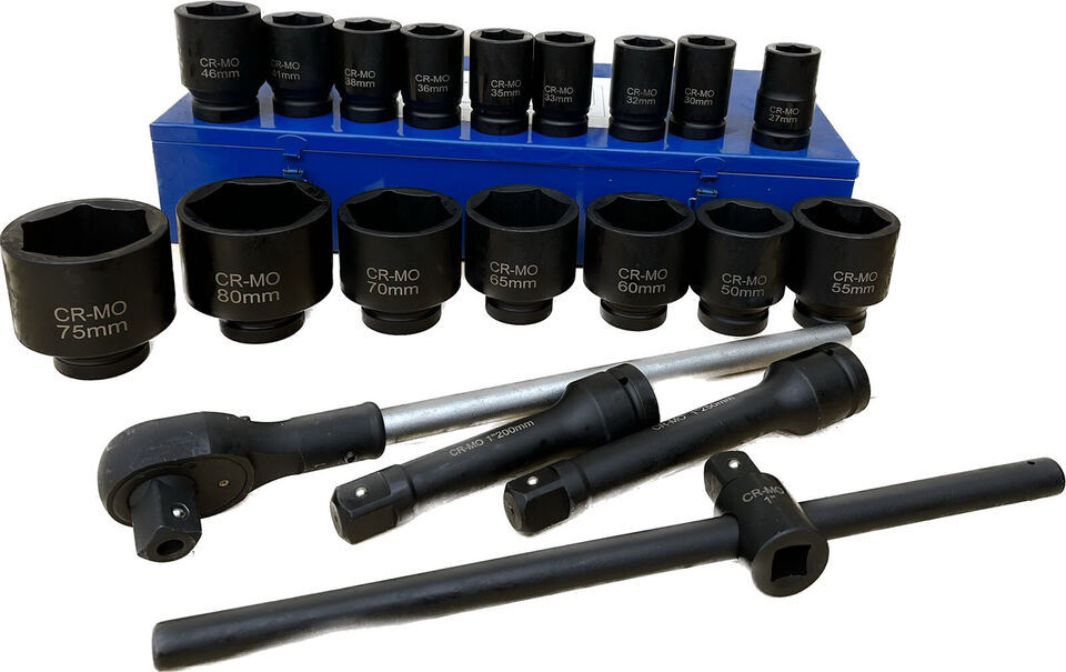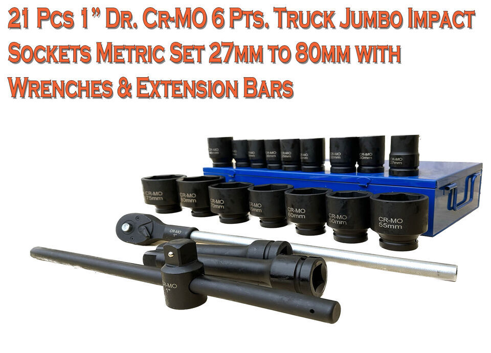 21pcs 1" Dr. Jumbo Impact Sockets Metric Set 27mm to 80mm Cr-Mo 6Pts w/Wrenches
