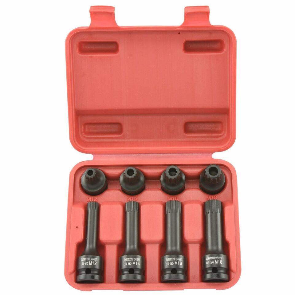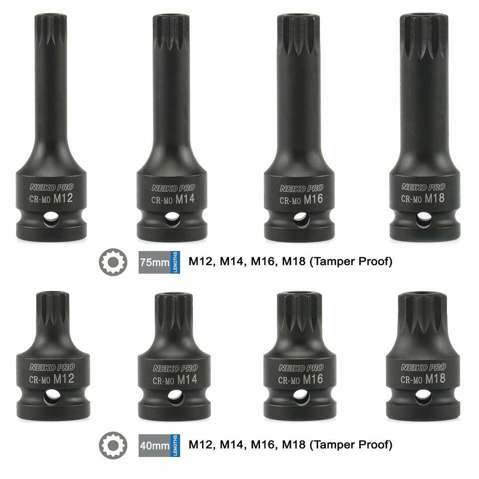 High-strength chrome moly steel construction and precisely milled tips deliver premium performance with an exact fit in fastener head. These tools are designed to be used with impact drivers to free rusted and over tightened bolts. Set Includes: 4-piece 1/2-inch drive Tamper XZN driver impact sockets (1-5/8 inch): M12, M14, M16, M18, and 4-piece 1/2-inch drive Tamper XZN driver impact sockets(3-1/8 inch): M12, M14, M16, M18. Storage and carrying case included.
