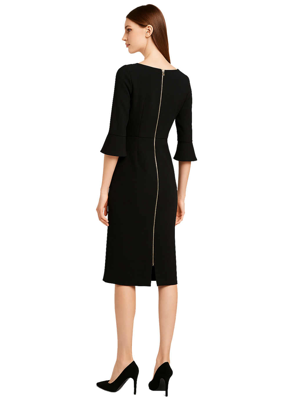 Crafted from 50% cotton and 50% polyester, the black asymmetric neck fitted midi dress features elbow-length sleeves with a belled cuff, and an exposed back zipper. We also has white available and it's in style of Ivanka Trump.