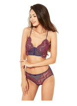 Cute comfy and perfect for layering, this ultra-thin unlined bralette features pretty floral lace, and a plunging neckline with adjustable spaghetti straps, front closure, and contrast colors. Finish off the look with the self-colored playful and cheeky hipster. Wireless. Soft and sheer. 3/4 cups