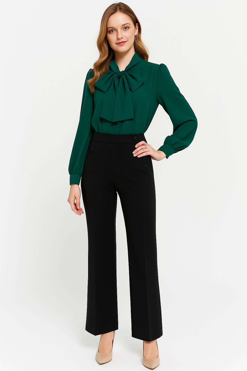 Queen Mary of Denmark Inspired Green Pussy-bow Blouse & Black Wide-leg Pants