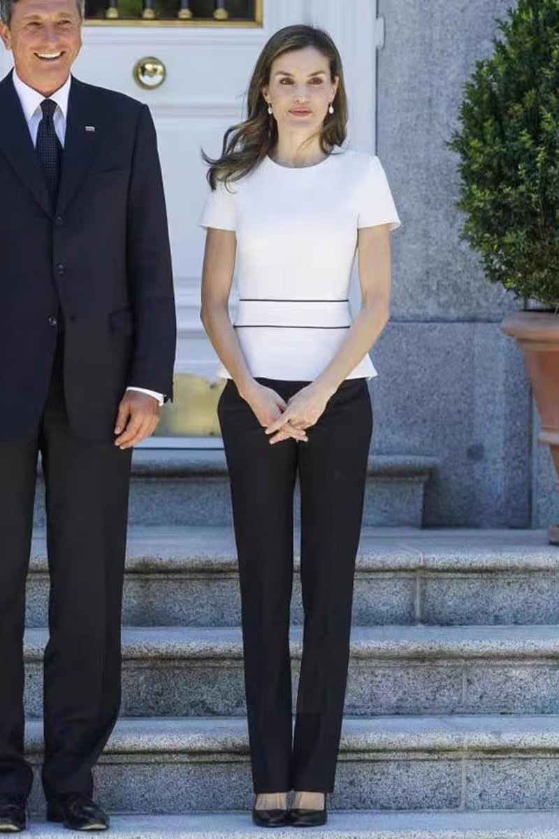 Witness the regal elegance of Queen Letizia as she welcomed the President of Slovenia in a captivating ensemble. Her choice of the peplum white 'Cherri' top by Hugo Boss, paired with sleek black straight-leg trousers, showcased her impeccable sense of style. Notably, Crown Princess Mary of Denmark also graced this exquisite top, effortlessly combining it with black trousers.