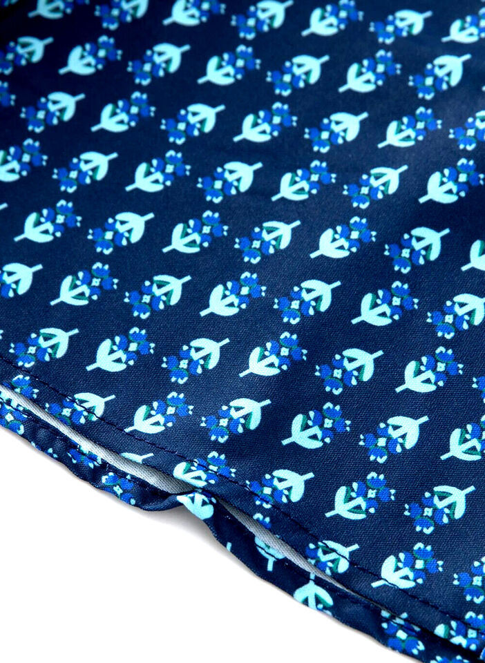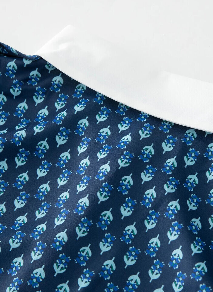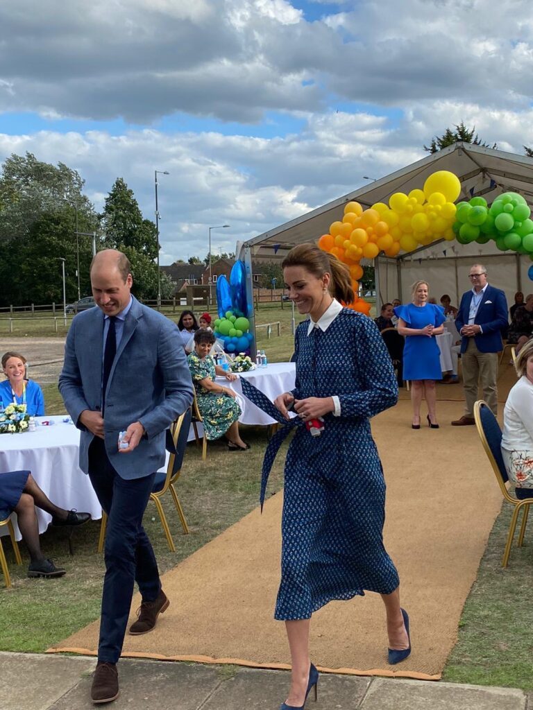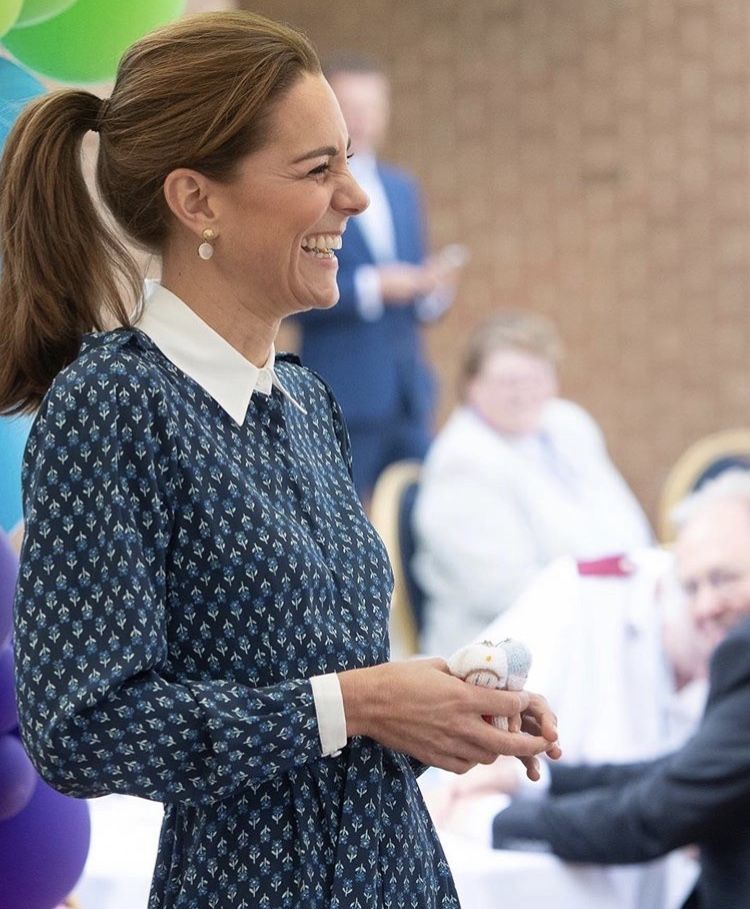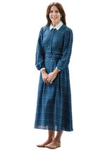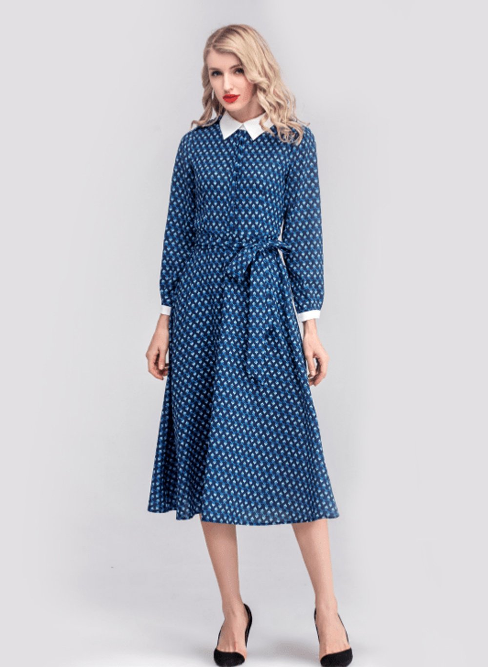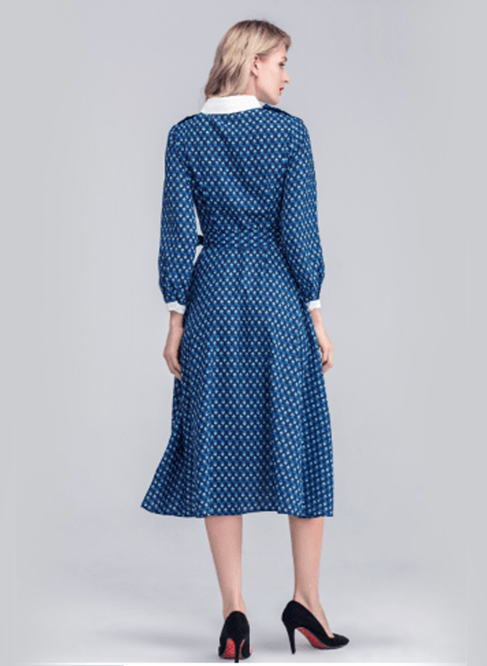 Kate Middleton Inspired Blue Geo Print White Collar Belted Flared Midi Dress