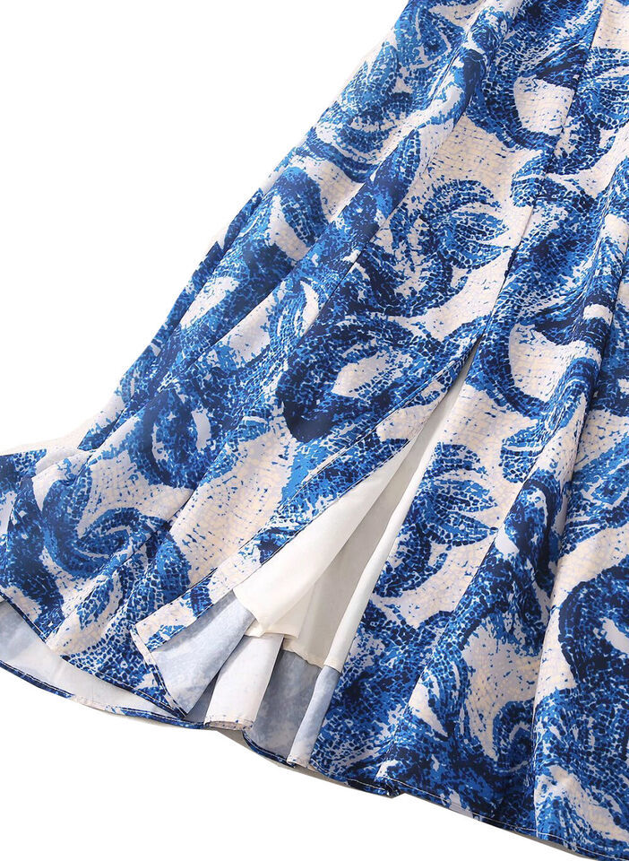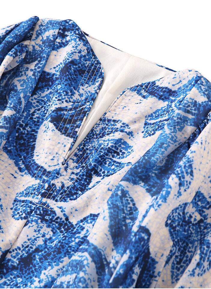 Queen Mary of Denmark Inspired Boho Blue and White Mosaic Pattern Midi Dress