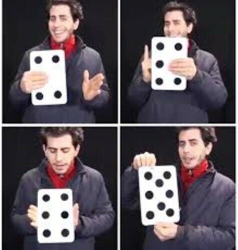 This is a classic effect that always pleases the audience. AKA - Dubious Domino, What's Next, Hoppin' Dots and Multiplying Dots. The Performer shows a jumbo card that has 1 black dot on one side, and 4 black dots on the other. When the card is shown again, strangely it has 3 dots on one side and 6 on the other. The card is shown a few more times, and each time the number of dots on its sides changes. At the end the Magician explains to the audience how the trick works, but as a surprise finish 8 black dots suddenly appear from nowhere filling the card completely! This is one of my "go to" effects I've been performing for over forty years!
