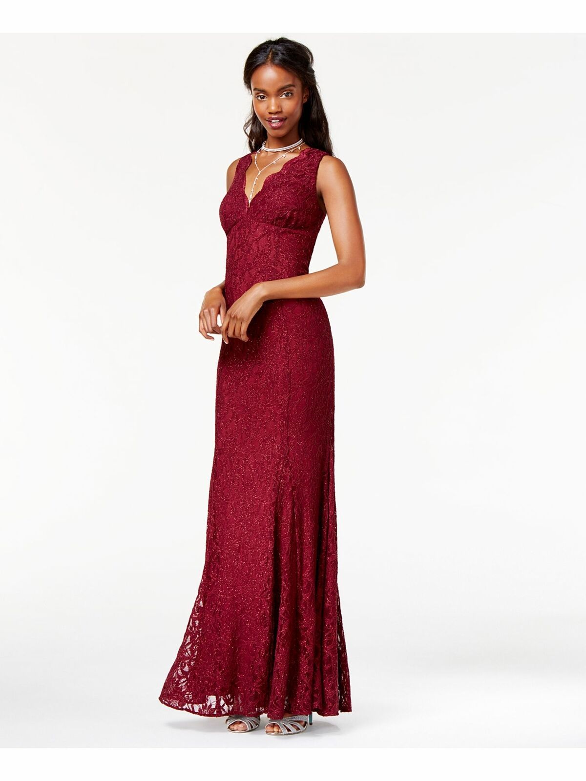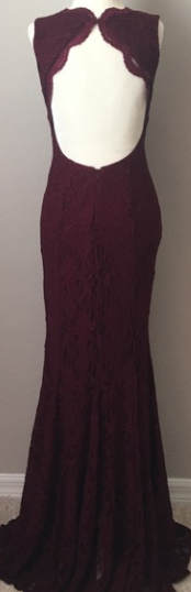 Beautiful deep wine colored lace dress. Floor length with stunning back detail! Their is a hint of sparkle in the lace as well . Nylon/Polyester/Spandex