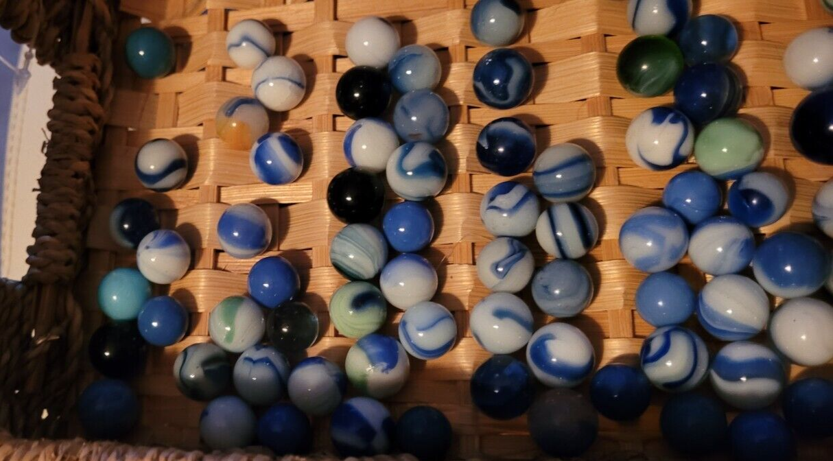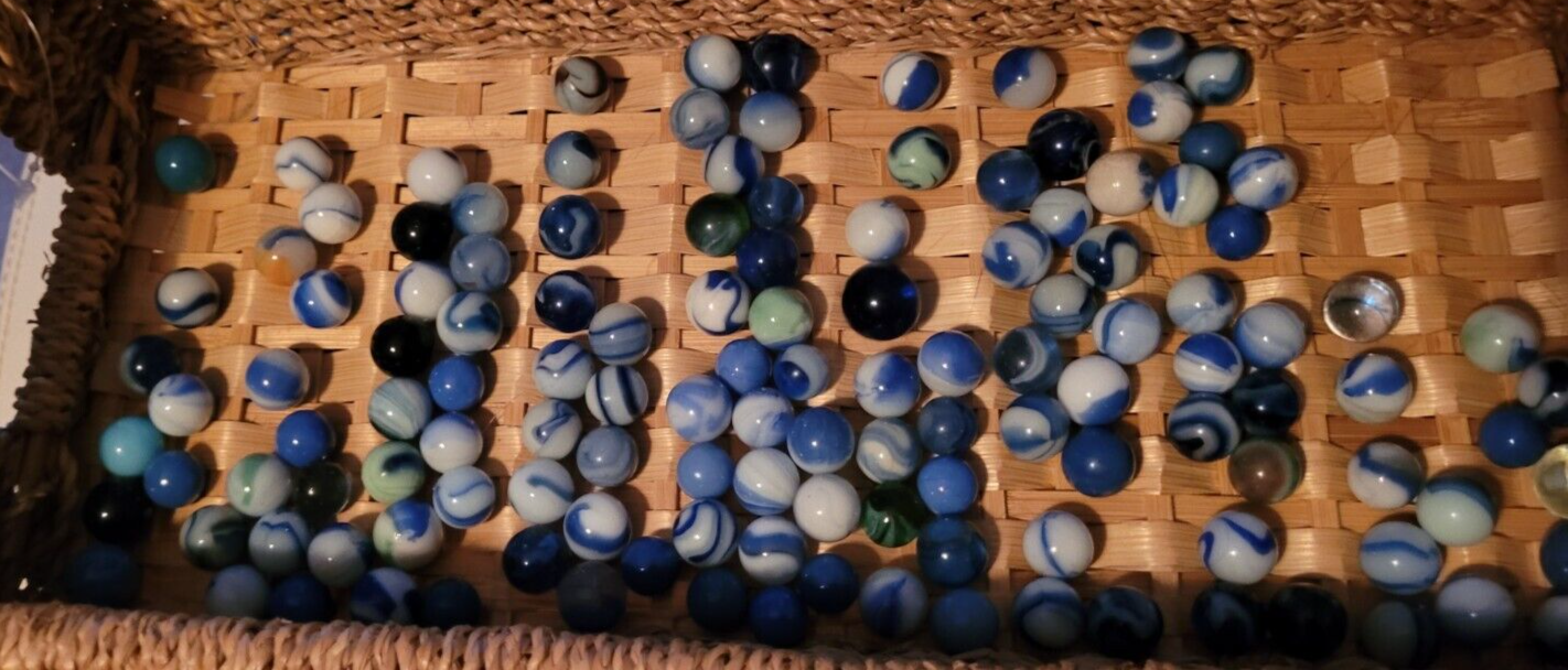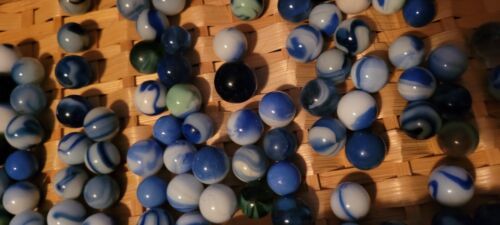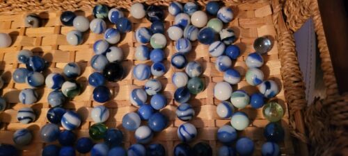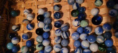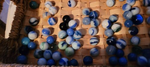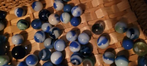 This medium lot of vintage marbles are in good used condition. We are no marble experts. They were acquired from an estate. There are no chips that I found. Some are blue and white swirling, some are solid blue, some have some green mixed in. They would make a nice addition to a collection or for decoration.