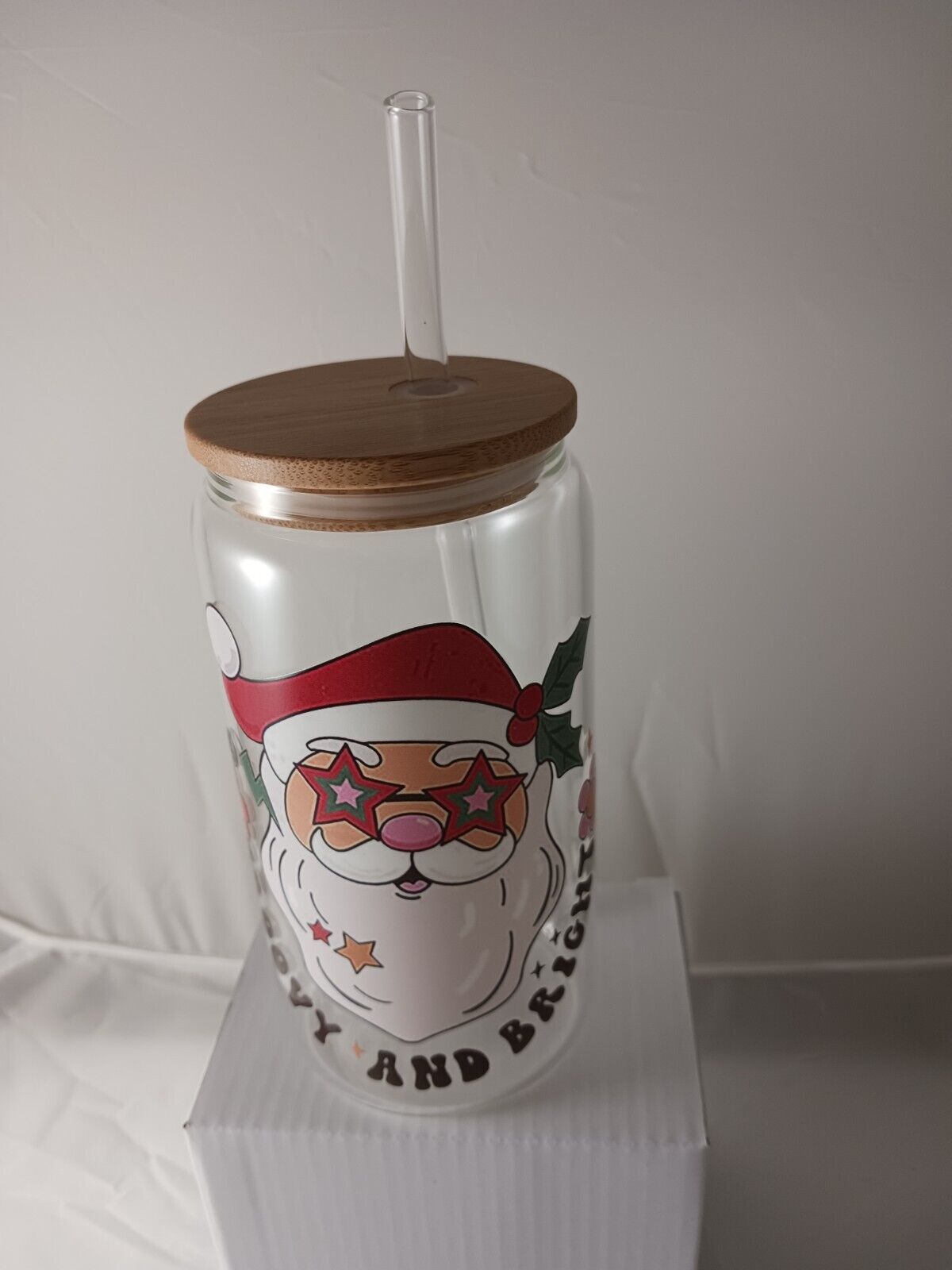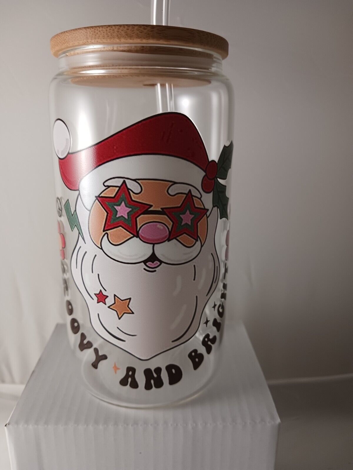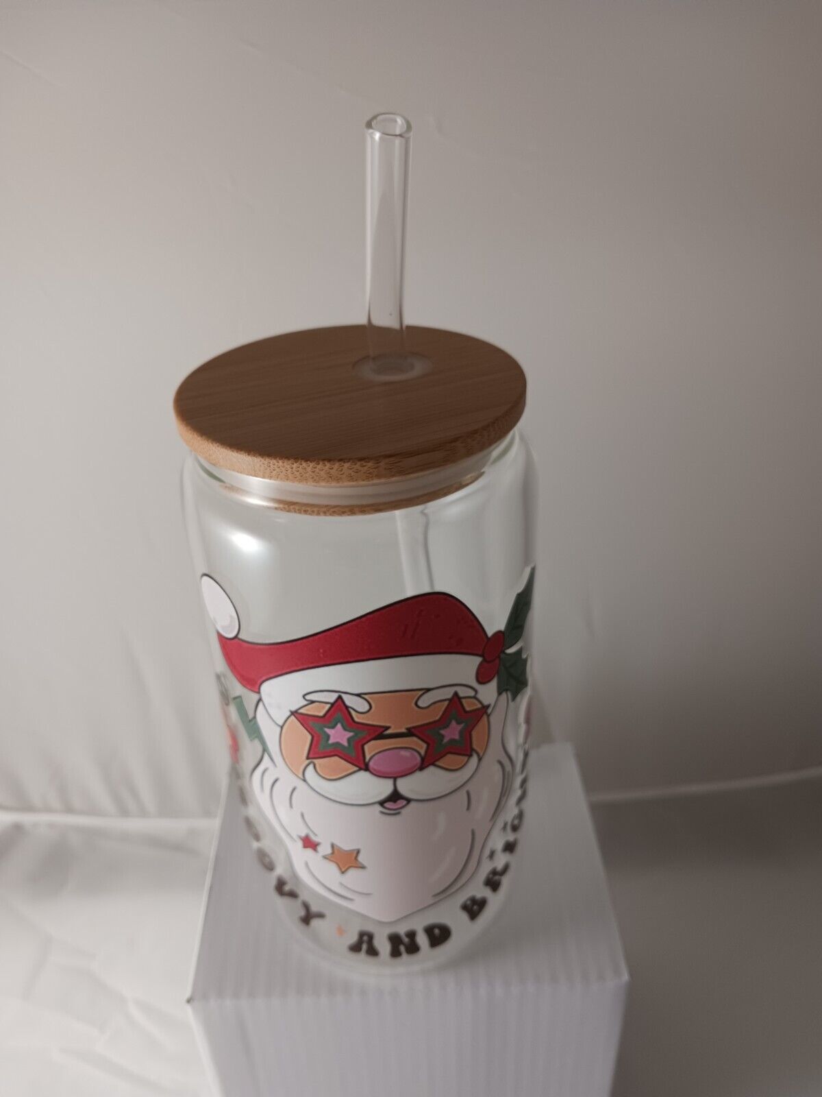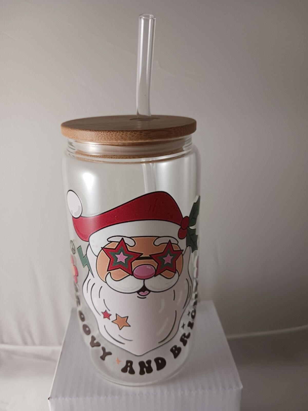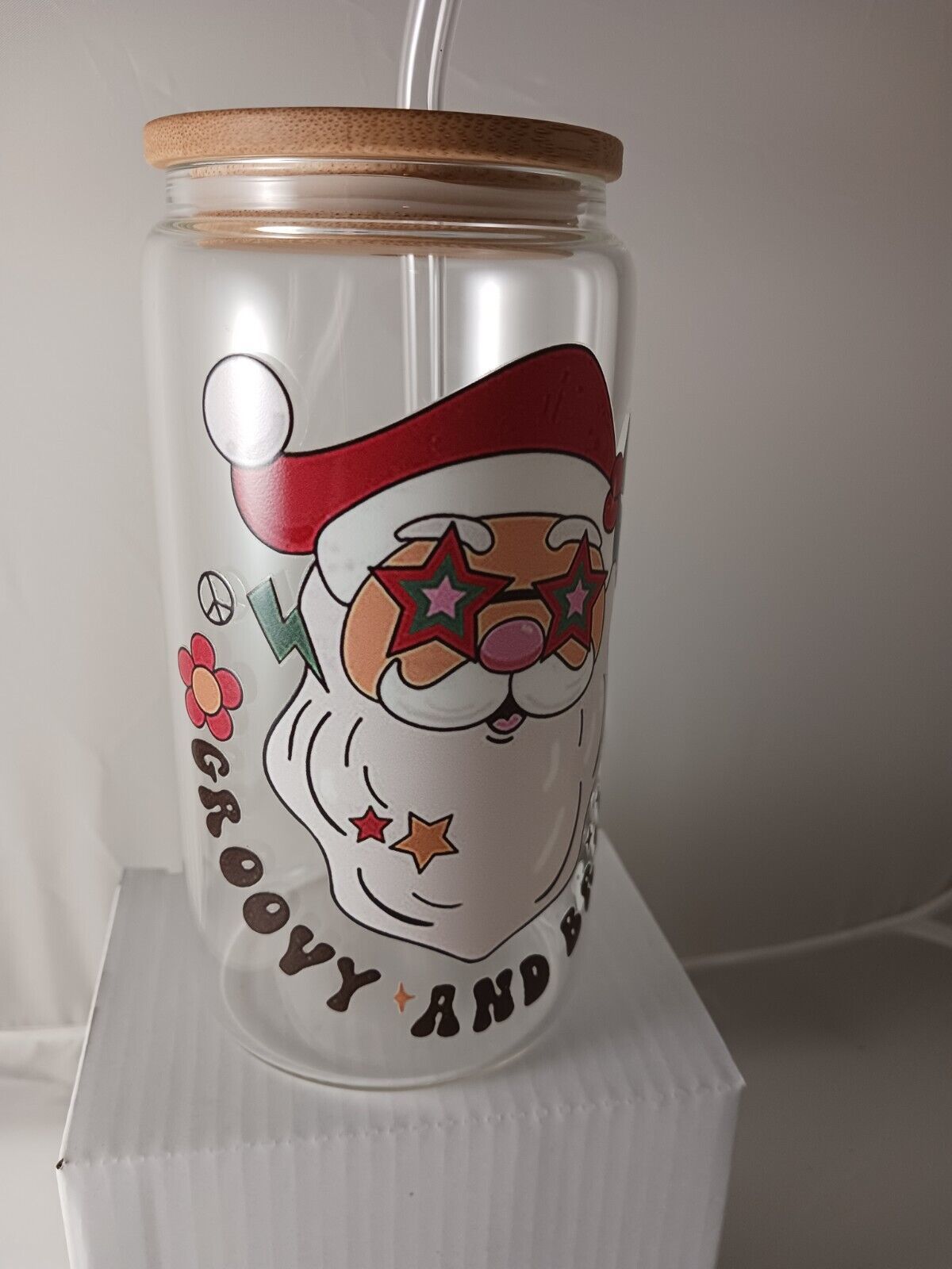 Enjoy your favorite cold beverage in this unique and festive glass cup with a bamboo lid and straw. The cup has a 16 fl oz capacity and features a groovy and bright Santa pattern, perfect for the holiday season. The UV DTF sticker adds a touch of personalization to the cup, making it a great gift option for your loved ones. Made of high-quality glass material, this cup is suitable for cold beverages and comes with a decorative design. The cup lid and straw set is perfect for a single serving, and the item height is 5.9 inches, with a width of 2.8 inches. Celebrate Christmas in style with this holiday-themed glass cup, perfect for any occasion.