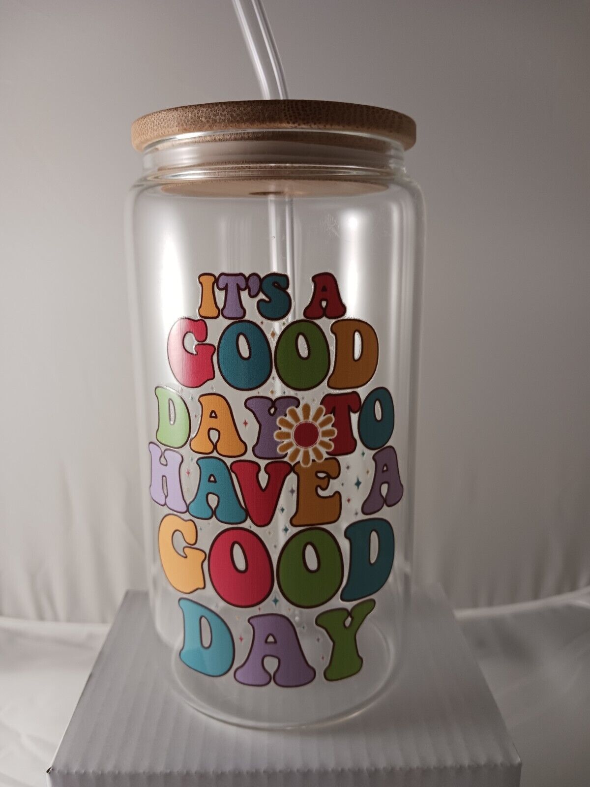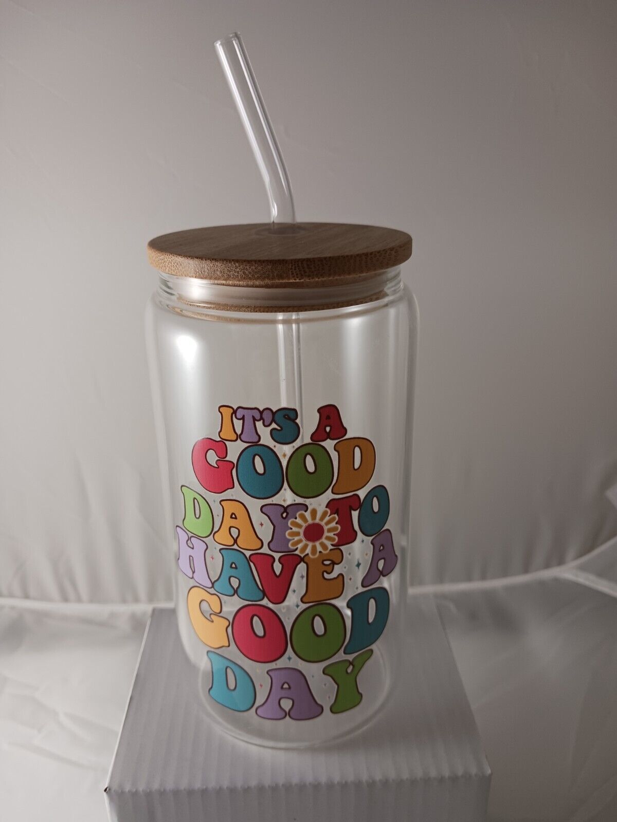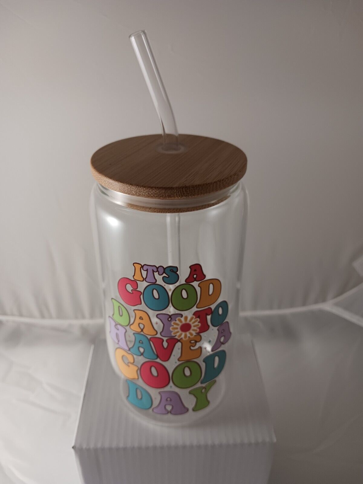 Glass Cup, Bamboo Lid, Straw, 16 Oz, UV DTF Sticker Applied, It's a Good Day To