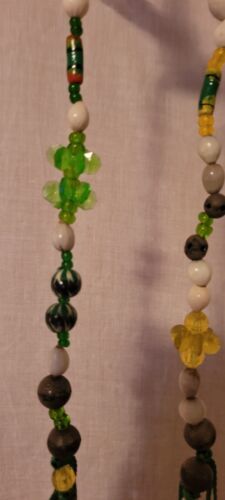 This necklace is in good used condition. It measures 13 inches without the dangle pieces. The pieces that are on this necklace are very interesting and colorful. This necklace would make a nice addition to an outfit or collection.
