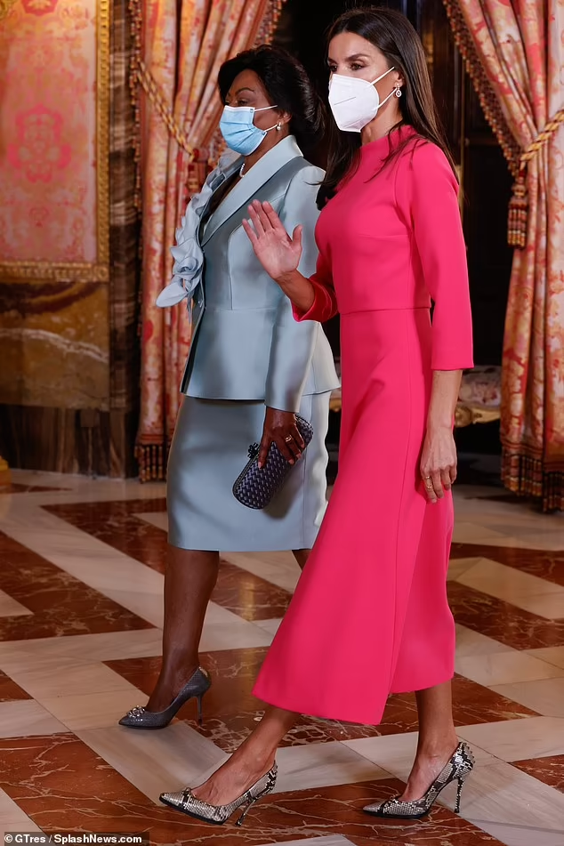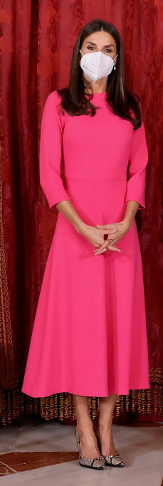 Capture the elegance of Queen Letizia's look with our budget-friendly inspired version of her stunning pink dress, which she wore in September 2021 while welcoming Angola's president to Madrid alongside King Felipe.