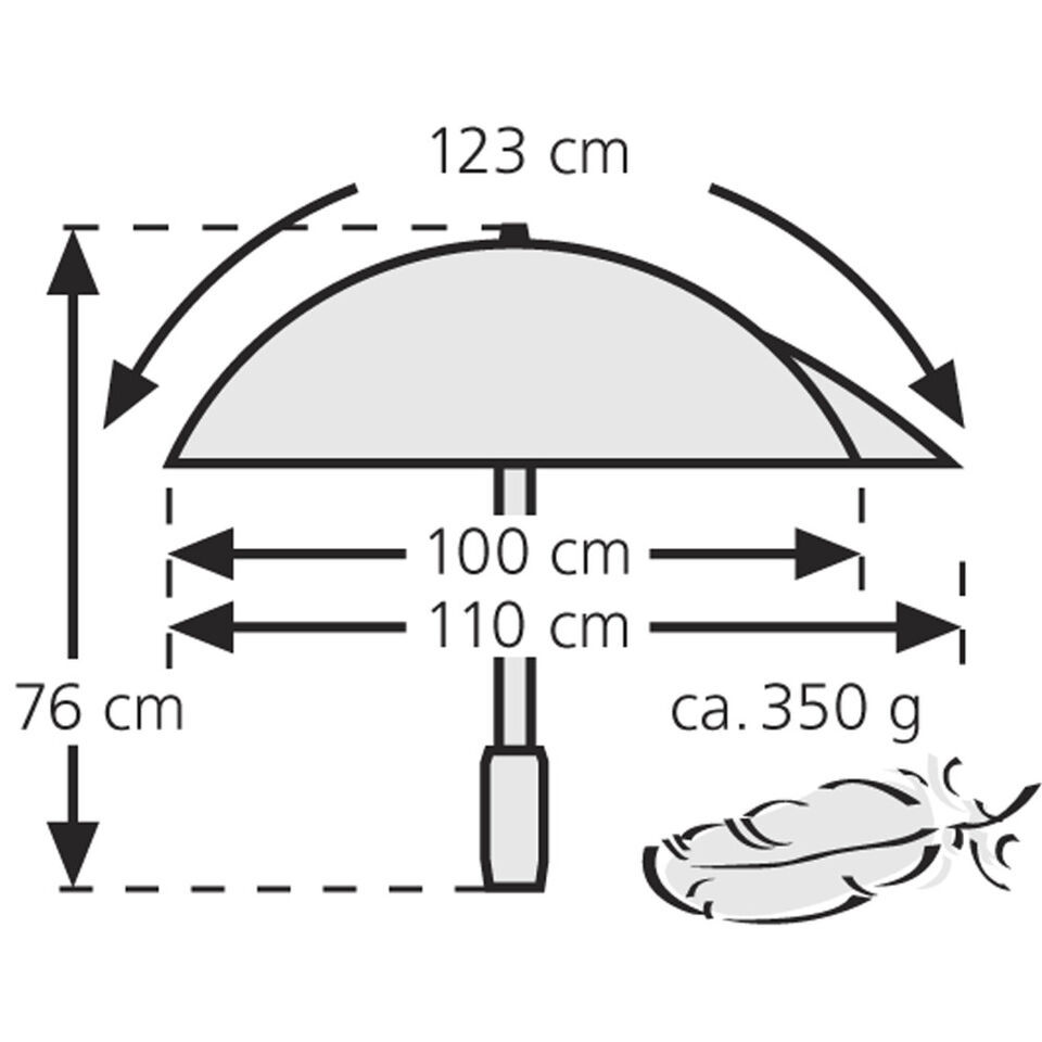 Swing Backpack is the windproof and lightweight rain shield with canopy extension! When opened by the safety runner, the three rear segments of the stick umbrella extend automatically. This additional canopy protects the space between back and backpack perfectly from rain. When the umbrella is closed, the canopy extension automatically folds back inwards and becomes invisible again Windproof and extra lightweight frame made of glass fibers: very robust, especially tempered glass fiber shaft; highly elastic, nearly unbreakable glass fiber ribs; all frame parts are corrosion-proof and durable Manual opener with patented safety runner makes opening and closing safe and comfortable - without caught fingers Extra lightweight polyester fabric with dirt and water repellent Teflon-treatment; Double seams between the canopy panels prevent the fabric from tearing up Grip-friendly, ergonomic EVA hard foam handle with adjustable carrying strap for every hand size Rounded safety tips reliably protect from injuries The opened umbrella can be hung up by a strap at the umbrella tip Convenient protection case with net insertion for optimum airing; the closed umbrella can be back carried comfortably thanks to the slip-free, adjustable carrying belt Weight: 12.8oz (362.9g)Canopy: 53" (134.6cm)Open Width: 48" (121.9cm)Open Length: 29.75" (75.6cm)Closed Length: 29.75" (75.6cm)