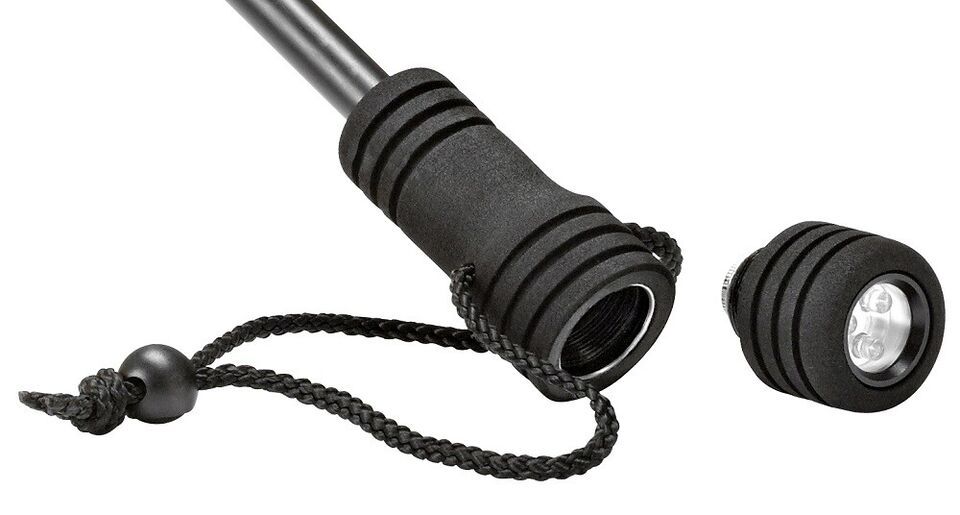 The first professional trekking umbrella with long lasting LED-flashlight is extremely durable and nearly unbreakable with only a minimum of metal parts and guaranteed high stability even in adverse operating conditions. This enhanced, light, handy and uncomplicated trekking-umbrella ensures a long-lasting lifetime. The materials are decay- and corrosion-resistant Patented scratch resistant safety tips Pin-spring system ensures comfortable opening and closing without pinching fingers Easy-to-find safety runner has proven to be a successful part of our high value golf umbrella program Double-stitched seams between the panels Practical folding carrying bag with adjustable carrier belt Comfortable high-density EVA foam handle with well-balanced grooved profile and adjustable wrist loop Weight: 12.48oz (353.8g)Canopy: 46" (116.8cm)Open Width: 37.5" (95.3cm)Open Length: 26.5" (67.3cm)Closed Length: 26.5" (67.3cm)
