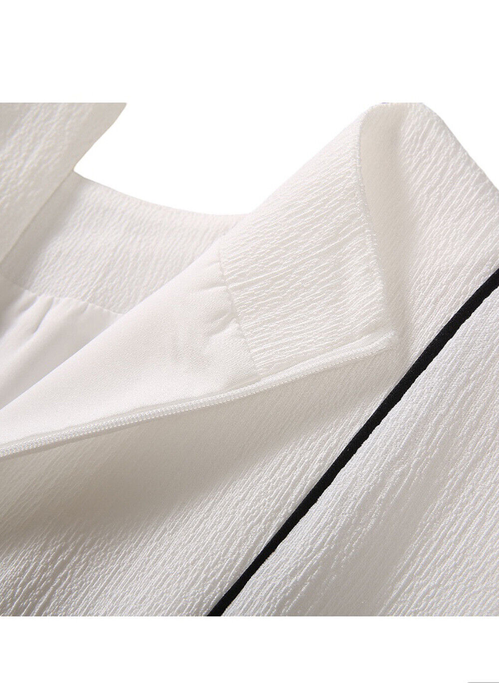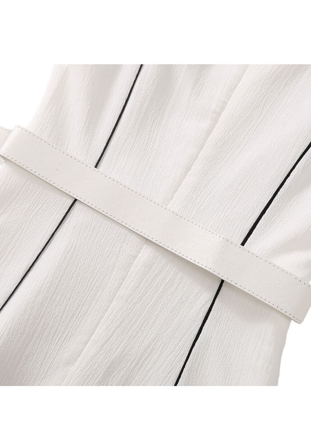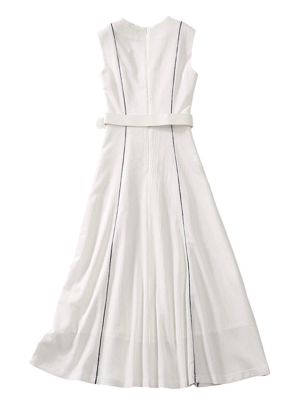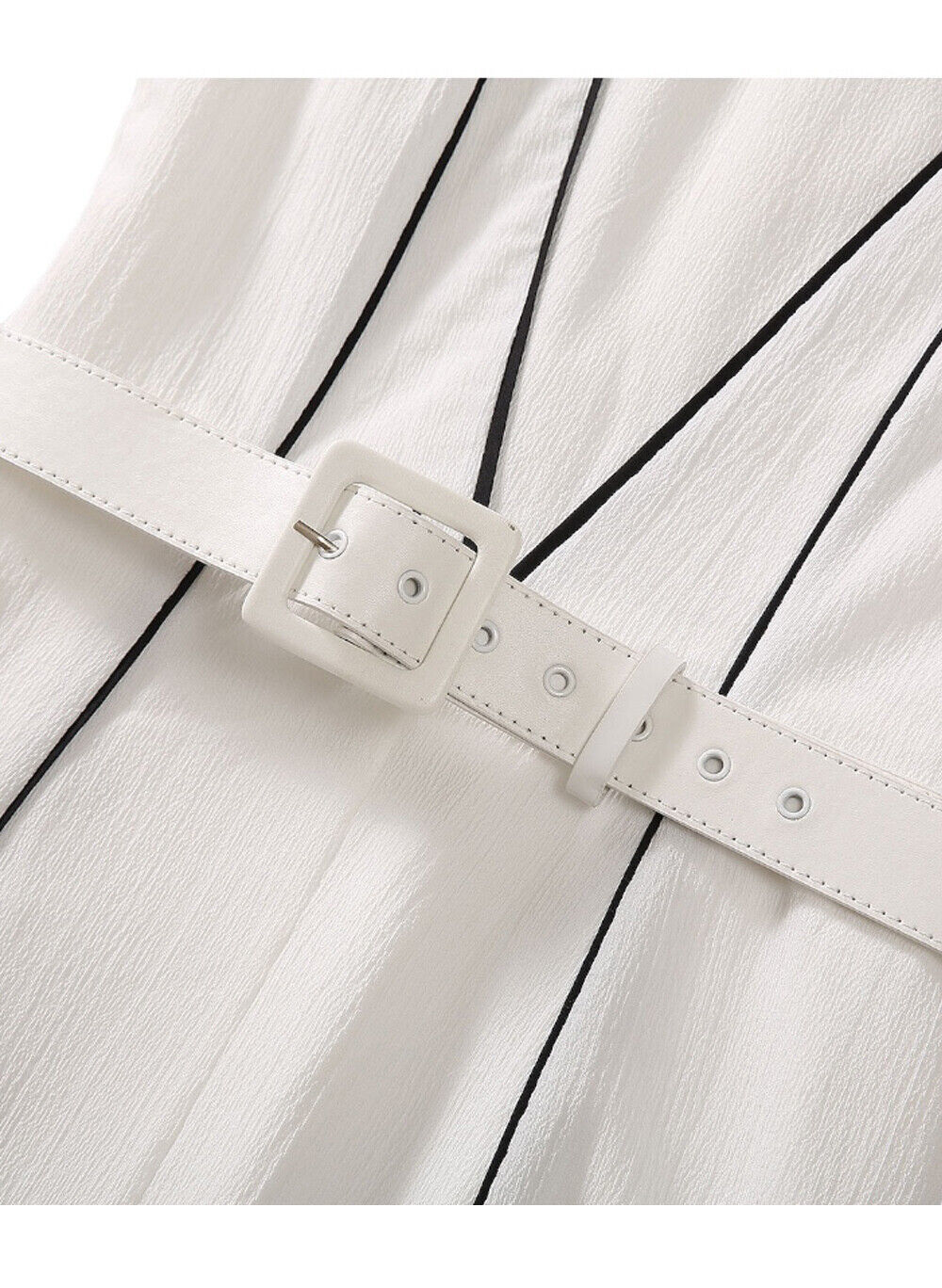 Constructed from a soft crinkled fabric, our affordable and inspired version in white showcases a sleeveless design with straight black vertical lines along both sides and the front of the dress. The mid-length dress is adorned with a white belt around its center. It comes fully lined for added comfort and refinement.