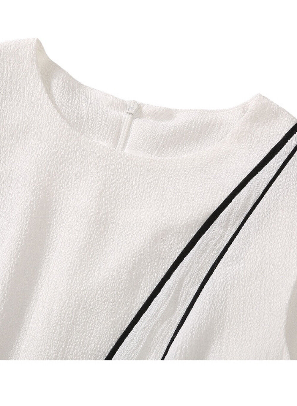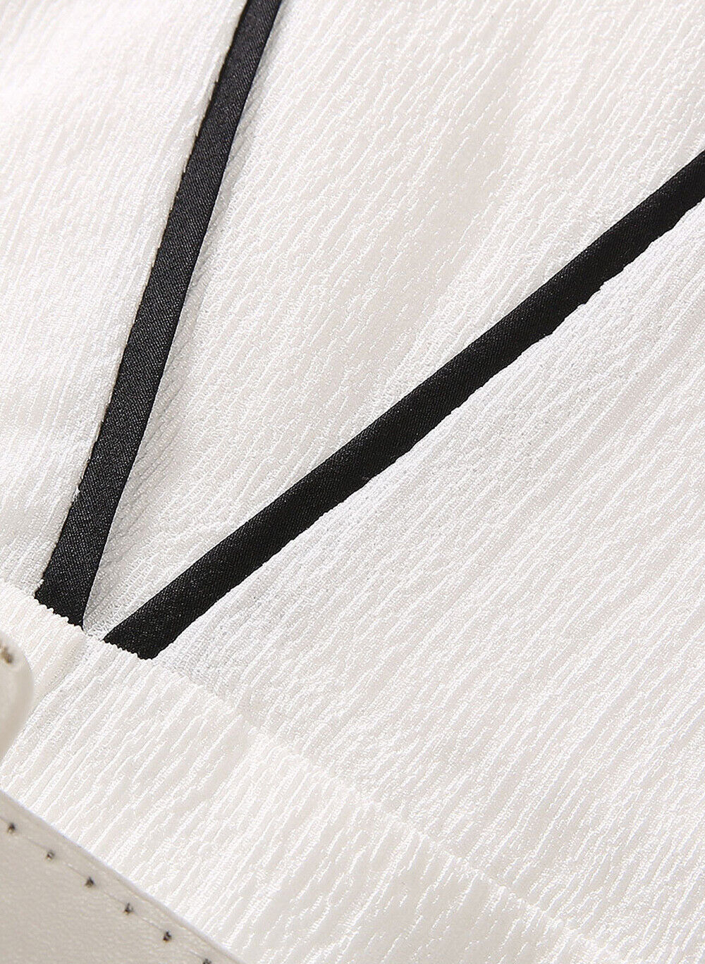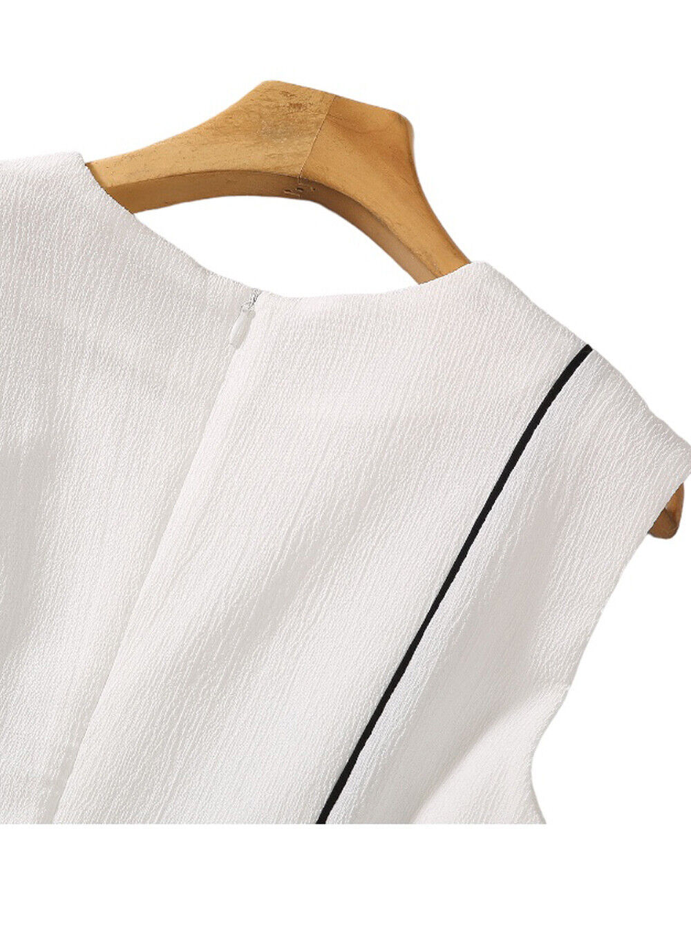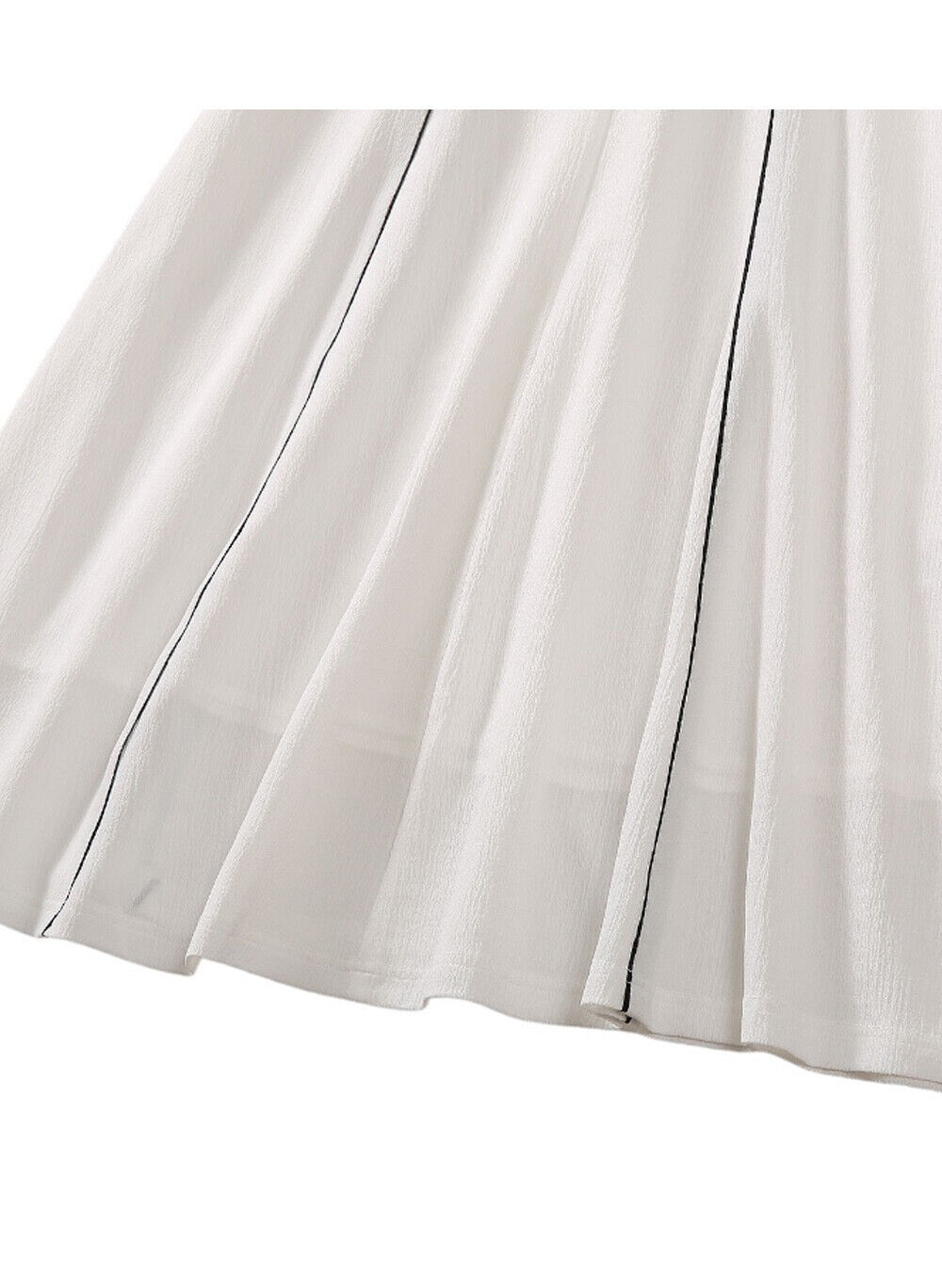 Constructed from a soft crinkled fabric, our affordable and inspired version in white showcases a sleeveless design with straight black vertical lines along both sides and the front of the dress. The mid-length dress is adorned with a white belt around its center. It comes fully lined for added comfort and refinement.