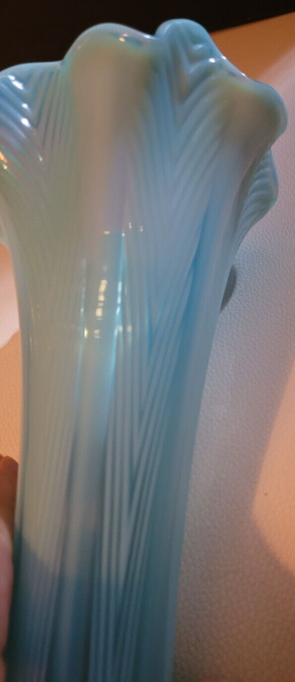 Vintage Northwood Carnival Blue 11.25 Inch Flower Vase Pulled Feather Top Swung