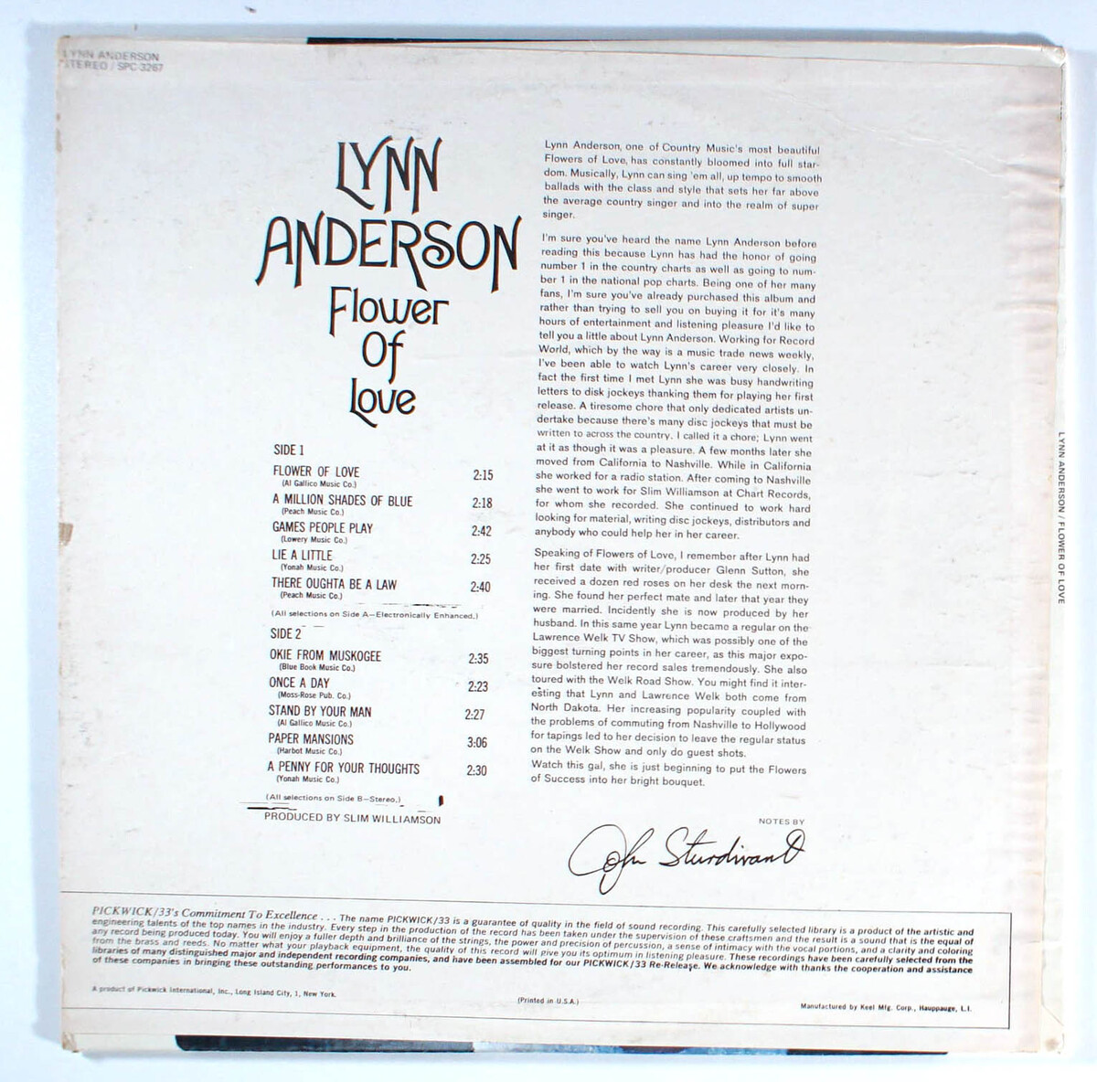 Flower of Love is a compilation budget album by Lynn Anderson. It was her first compilation release for the Pickwick label. It features songs Anderson originally released while recording for Chart Records in the 1960s. Most of the songs included on the compilation are cover versions of the originals by other artists. Examples of this include the title hit by Leon Ashley, Connie Smith's Once a Day, Tammy Wynette's Stand by Your Man, Dottie West's Paper Mansions and Merle Haggard's Okie from Muskogee. Anderson's mother, Liz Anderson, was the composer of Lie a Little and a Penny for Your Thoughts.