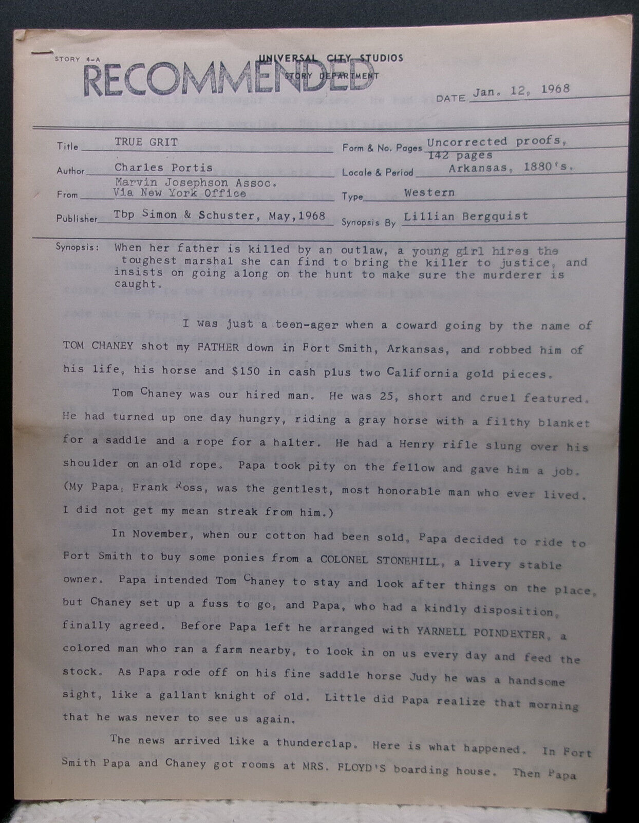 Charles Portis TRUE GRIT Universal City Studios 16 Page Synopsis for Filming