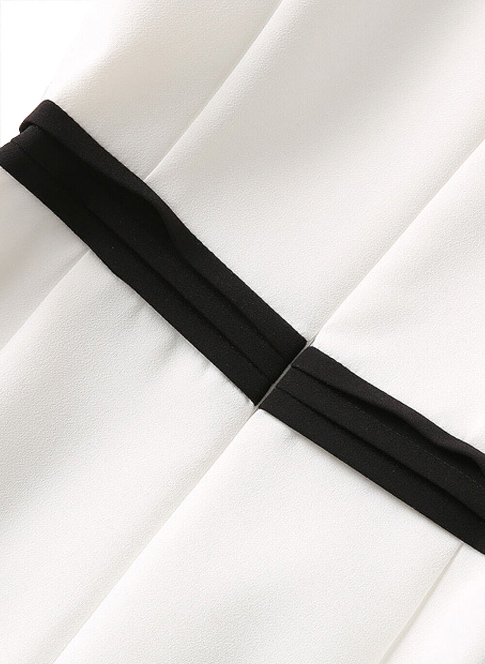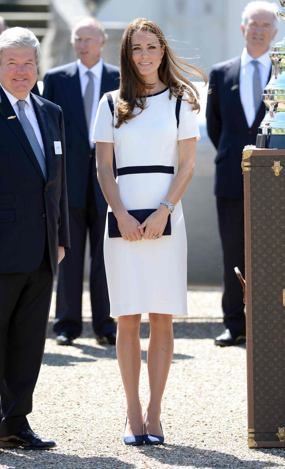 Channeling timeless style, the Princess of Wales graced the America's Cup in a stunning white shift dress with a nautical twist. This classic knee-length dress showcases a fitted silhouette, accentuating her graceful figure. With its charming cap sleeves, round neck, and black trimming, this ensemble exudes sophistication.