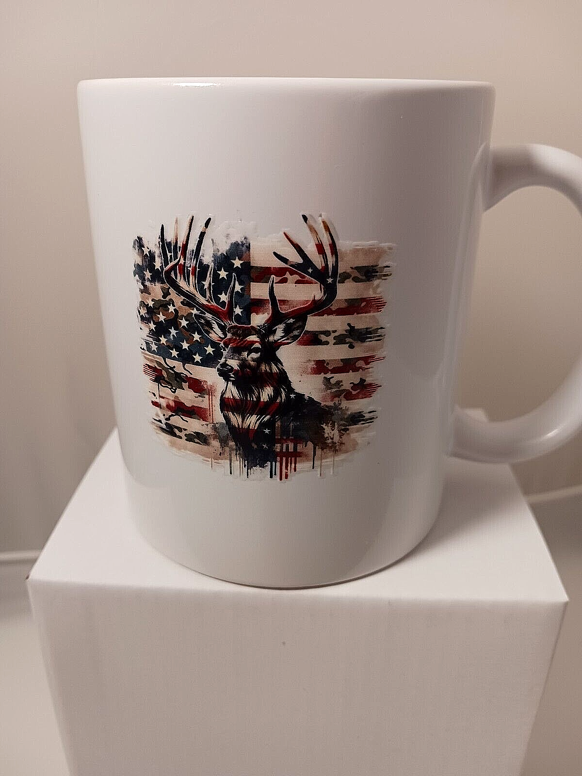 Enjoy your morning coffee in style with this beautiful white ceramic coffee mug. The round shape and 11 oz capacity make it perfect for all occasions. The mug features a stunning deer with American flag design, which is sure to add a touch of patriotism to your morning routine. Made with high-quality ceramic material, this mug is suitable for hot beverages and comes with a UV DTF sticker for added decoration. Measuring 3.8 inches in height and 3.2 inches in width, this mug is perfect for anyone who loves a good cup of coffee. Whether you are enjoying your coffee alone or hosting a party, this mug is a great addition to your collection.