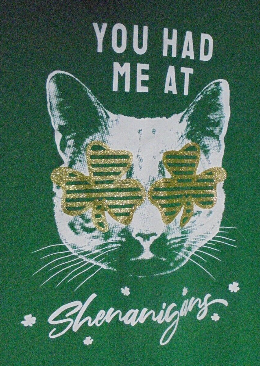 St Patricks Day Cat Womens Large Irish Shenanigans Shamrock Glitter TShirt Green