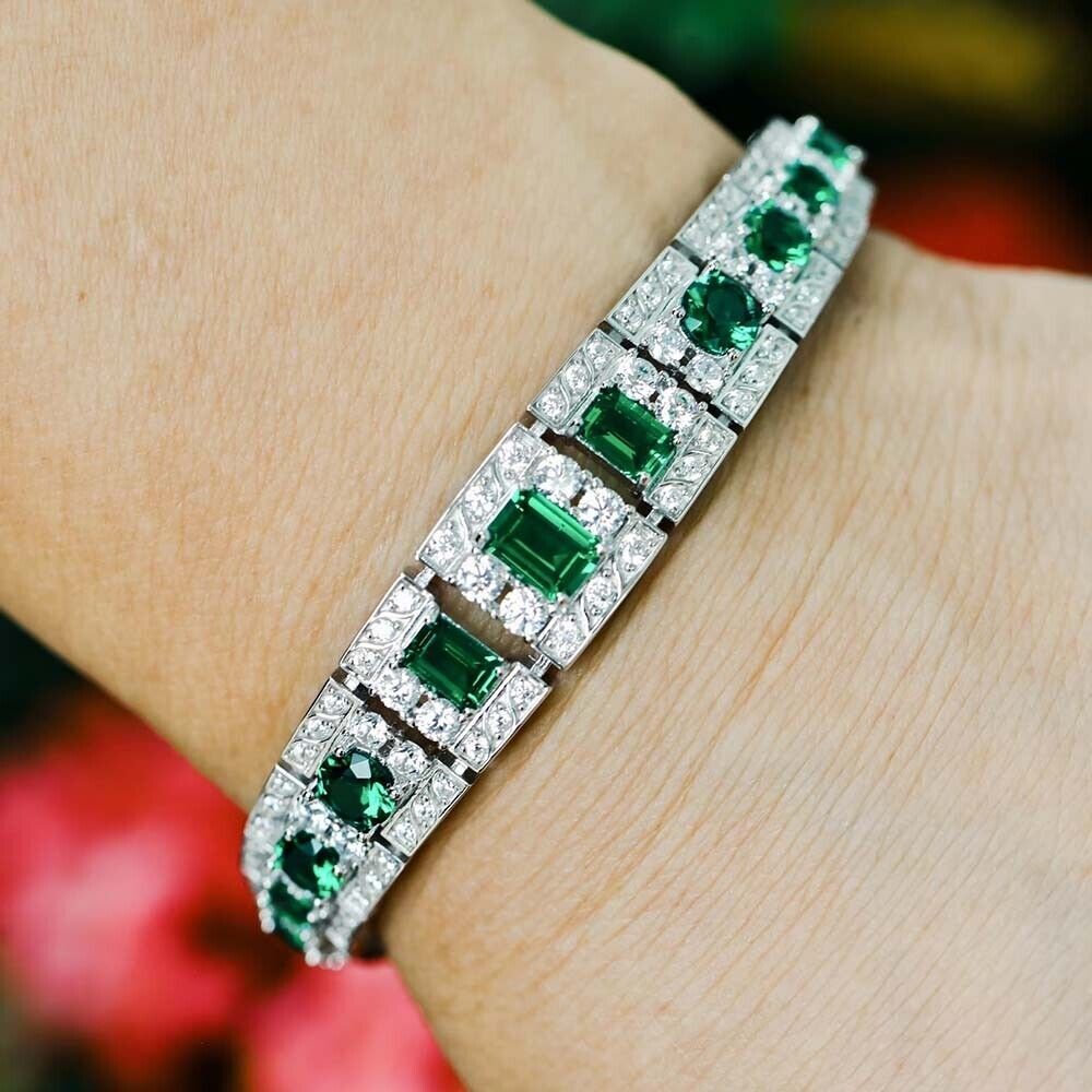 Lab Created Emerald & Diamond 14K White Gold Plated Cuff Antique Bracelet 7"