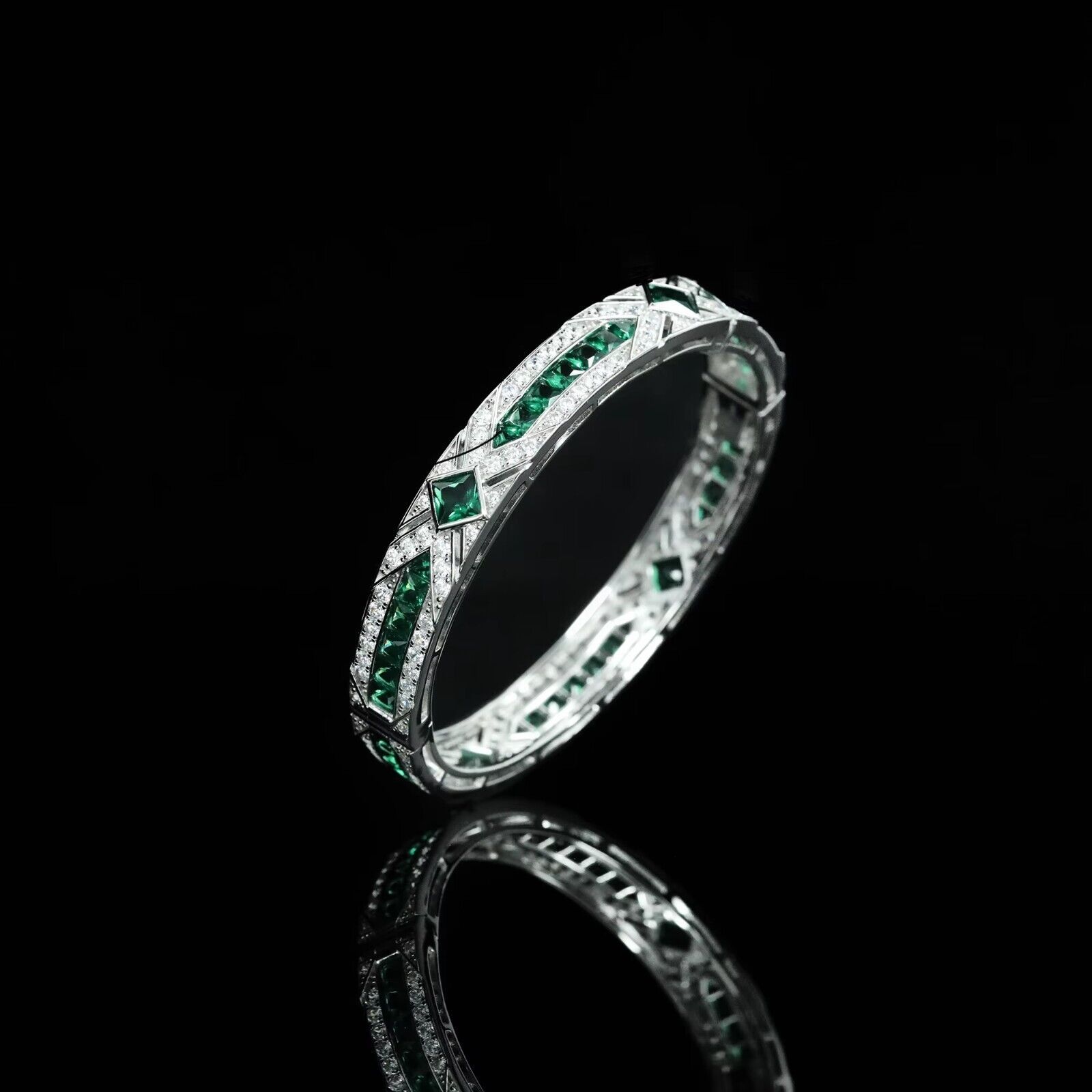 Lab Created Emerald & Diamond 14K White Gold Plated Treasure Antique Bracelet 7"