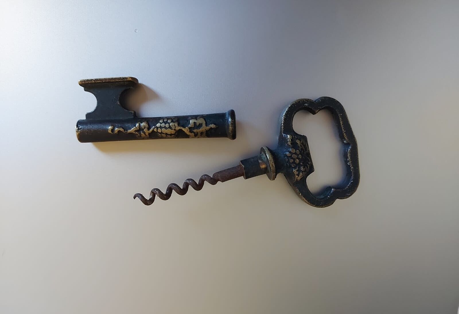 Brass corkscrew made in Germany during the '50s, at choice between the gold "In Vino Veritas" design and the gold/black one with cups and bunches of grapes.