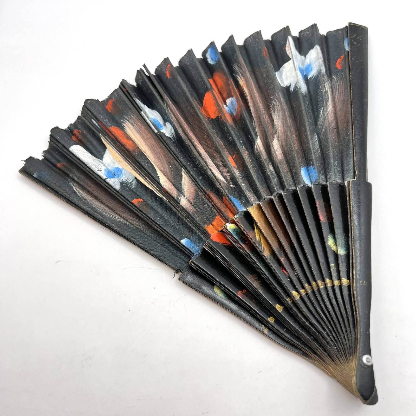 Unusual Vintage Asian Black Folding Hand Fan Hand Painted Flower Wooden Fabric