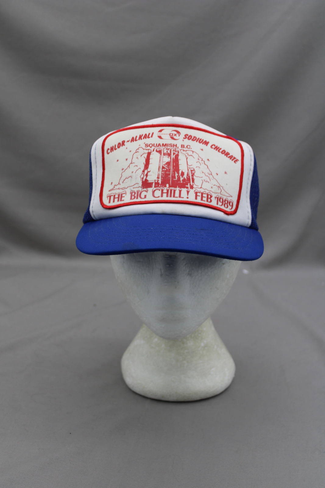 Up for sale is a vintage patched trucker hat. It has a blue base colour with a white front. The front of the hat has a huge screened patch crested on for Oxy Canada's Big Chill event in 1989. What a great vintage hat do not miss out on it.