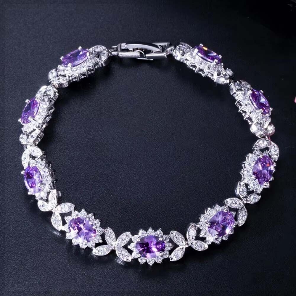 Lab Created Tanzanite & Diamond 14K White Gold Plated Bangle Bracelet 7.25"