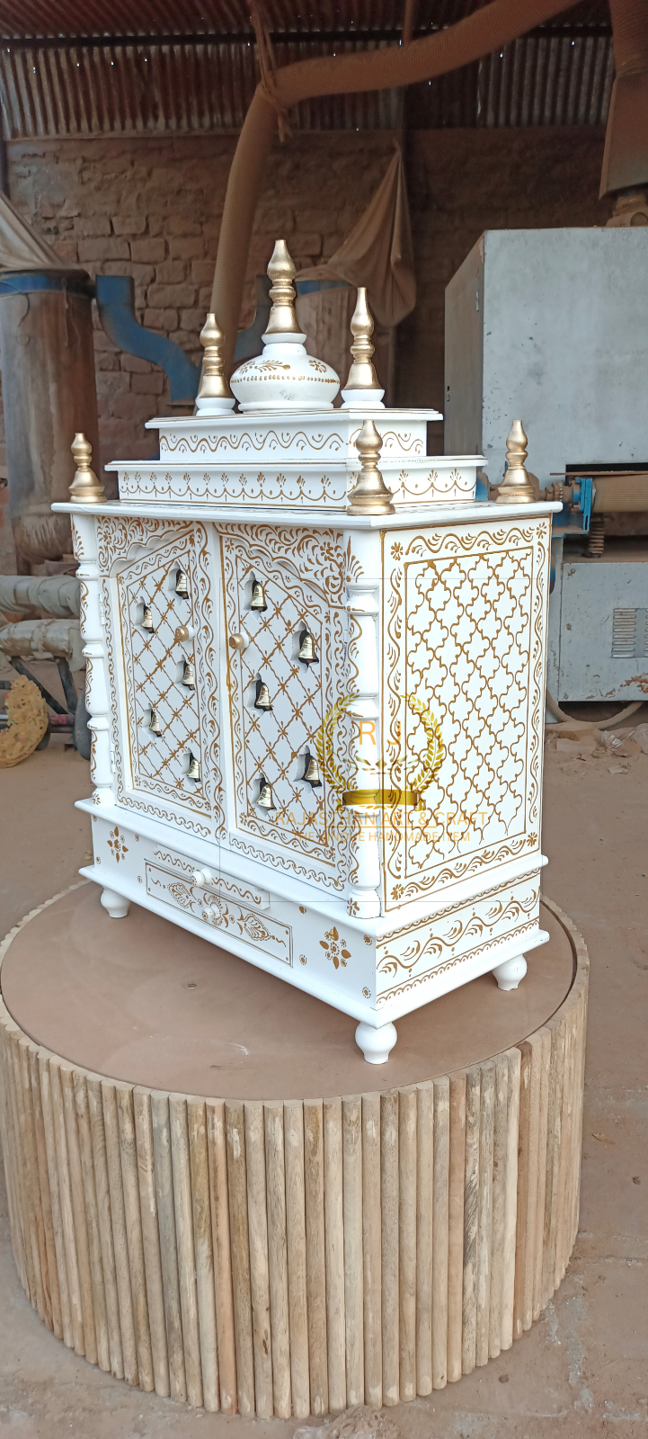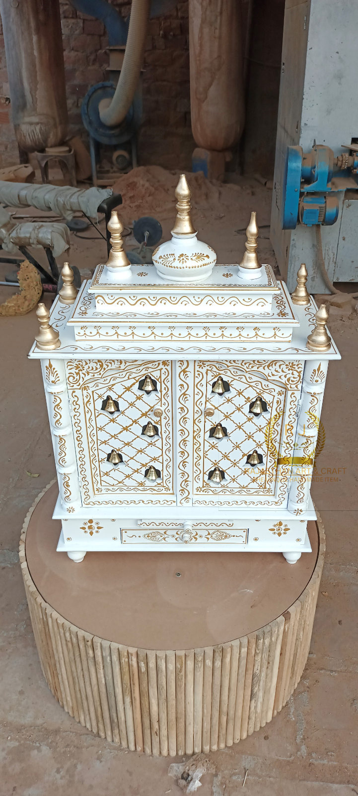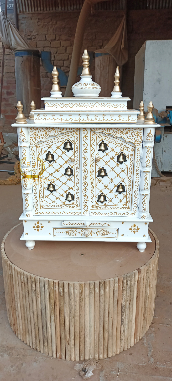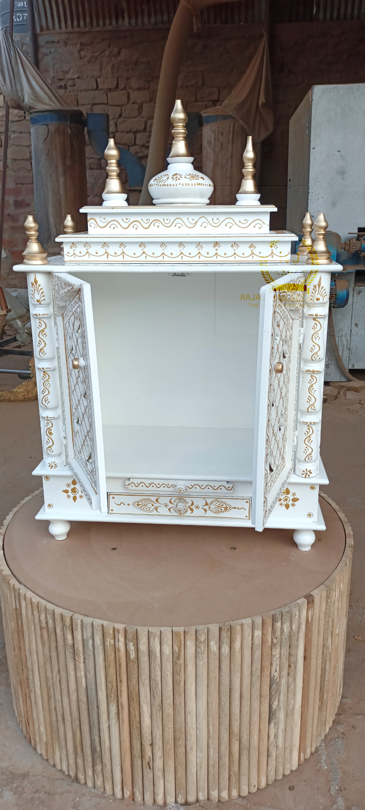 Wooden temple wood Open pooja temple Marble Look White Paint Drawar pooja shelf