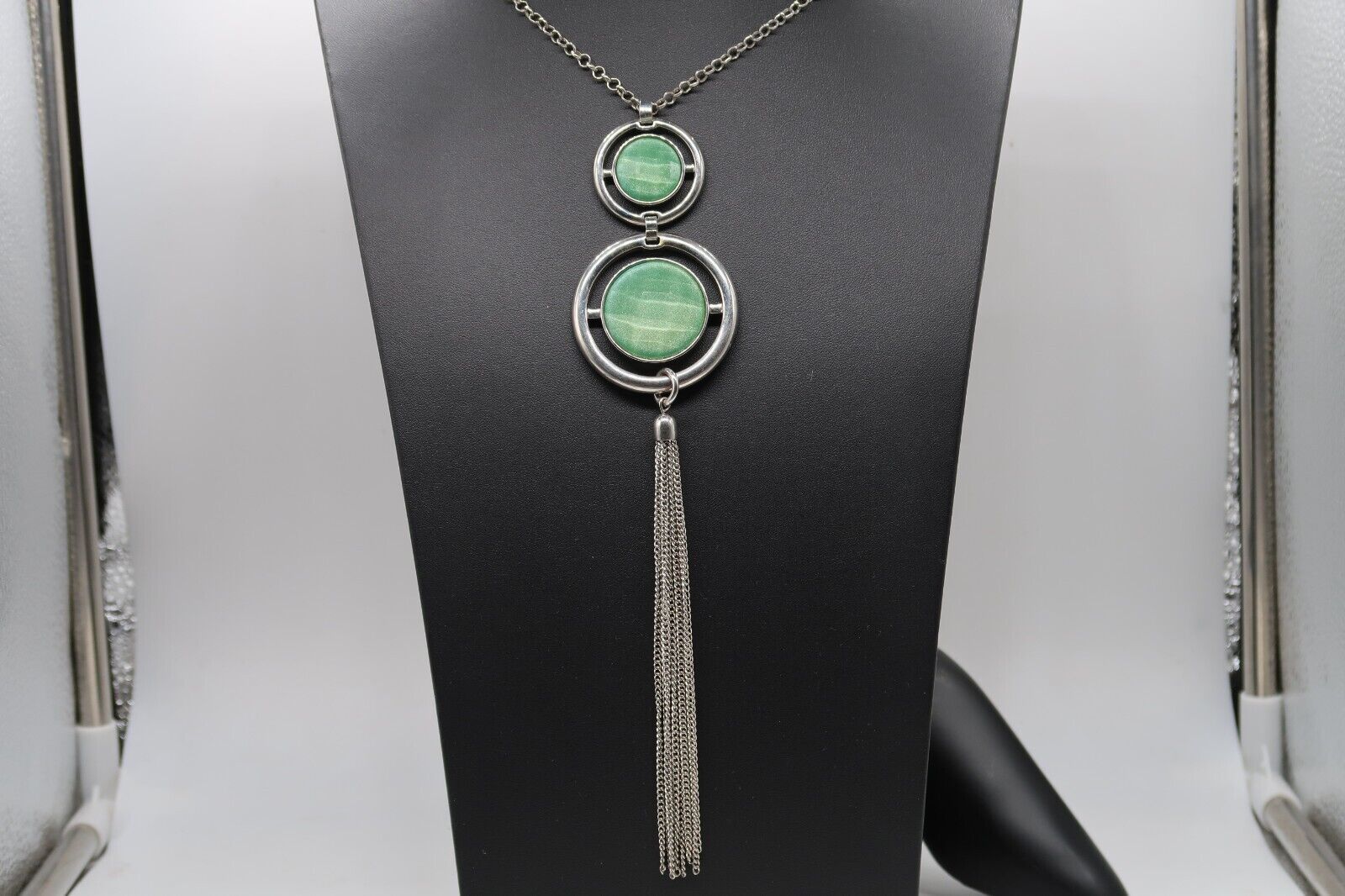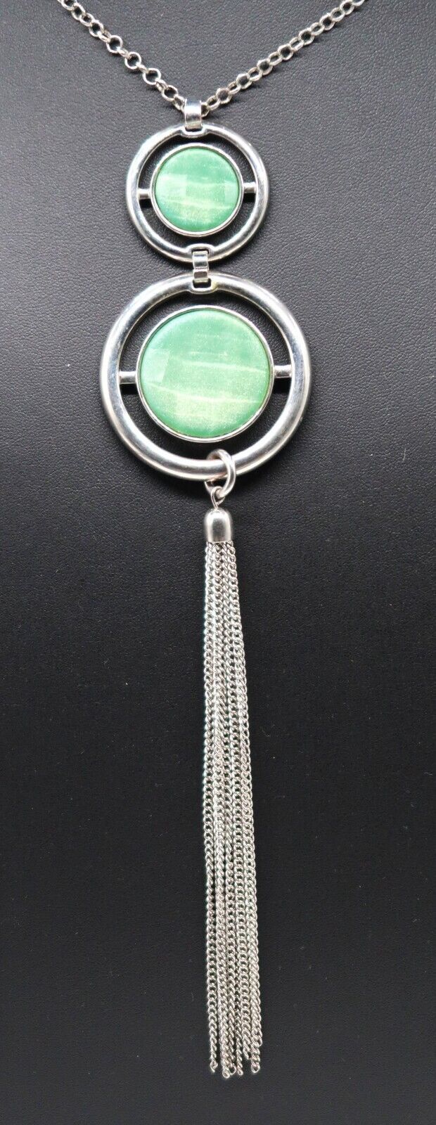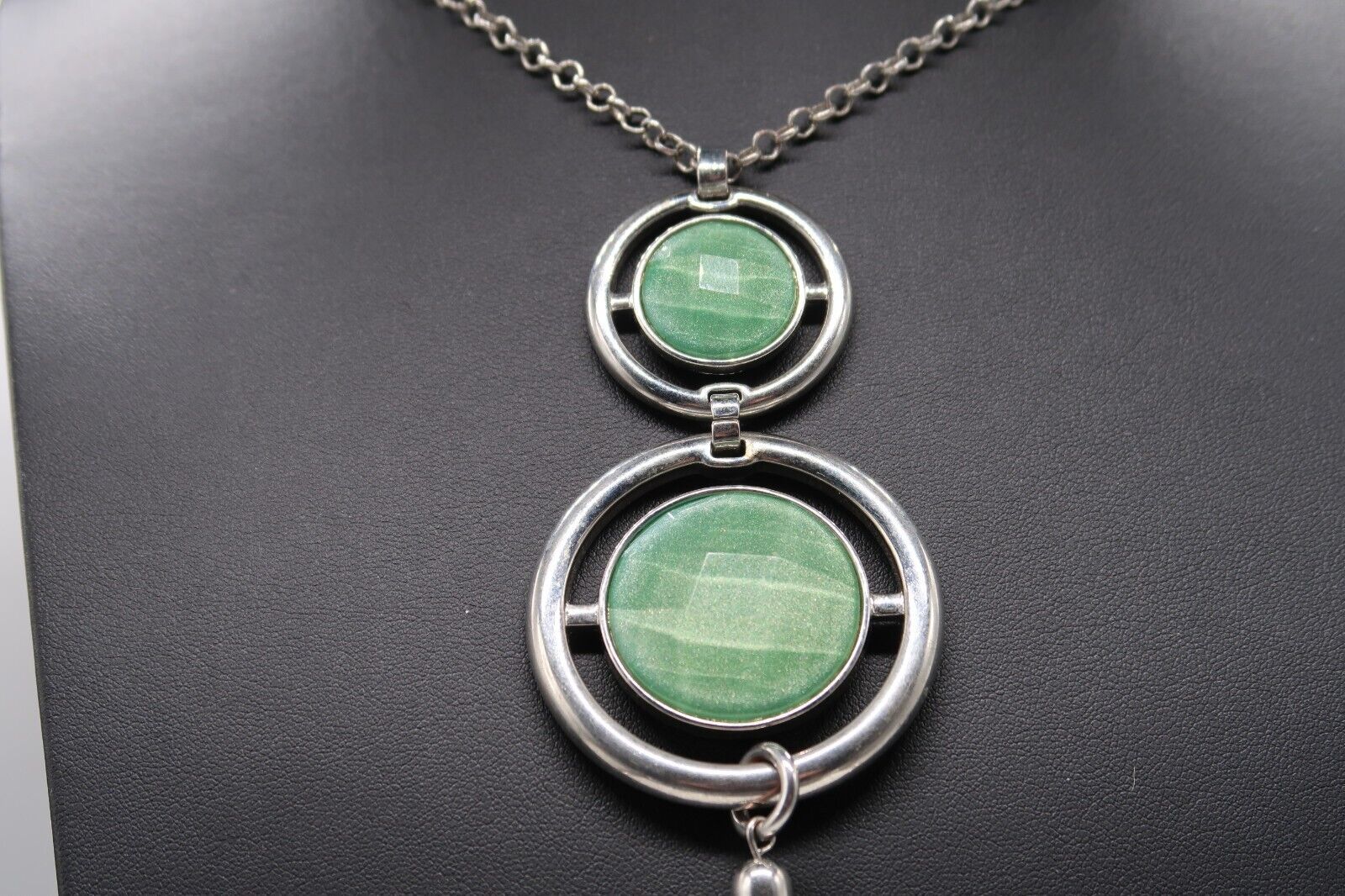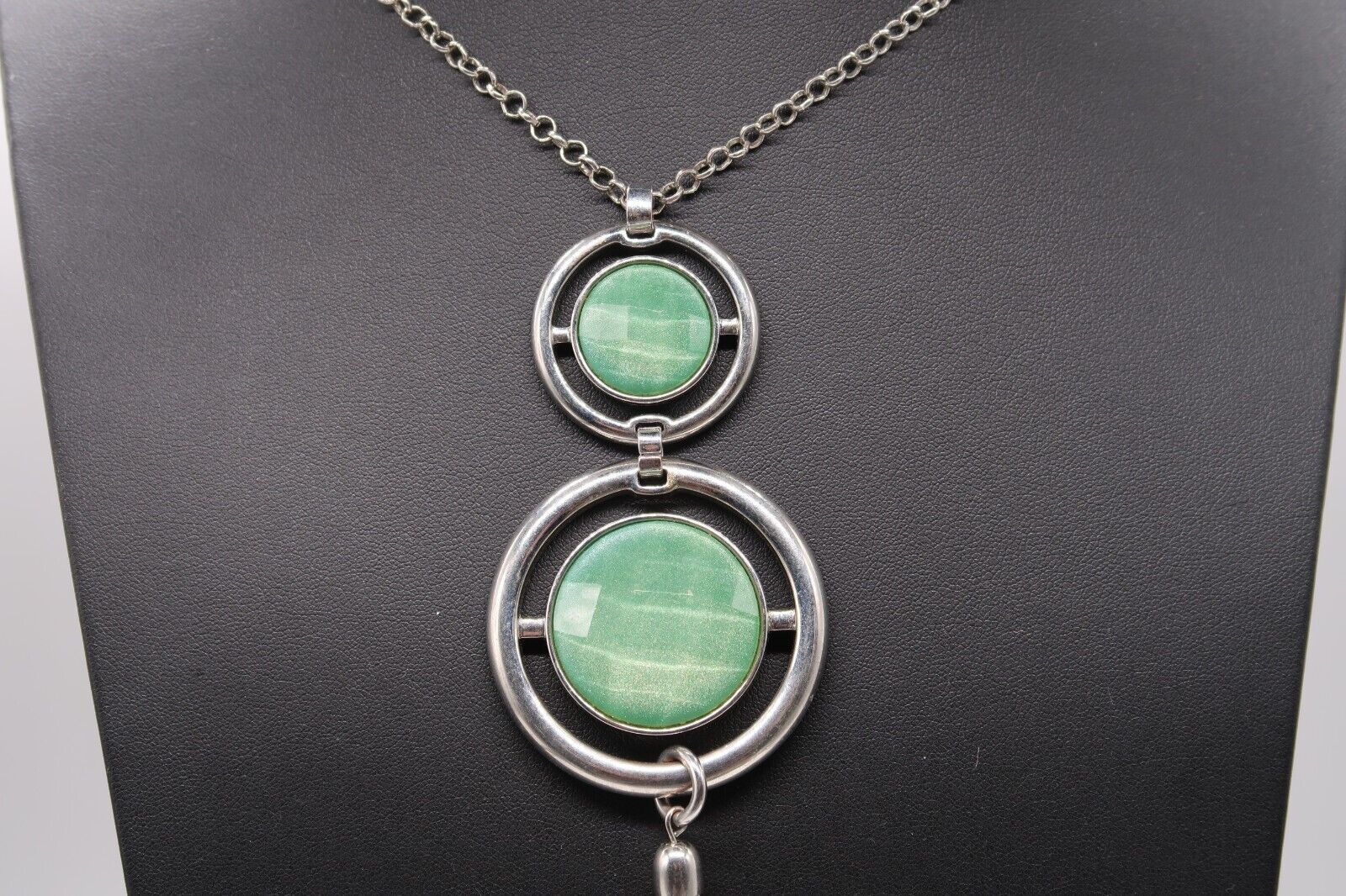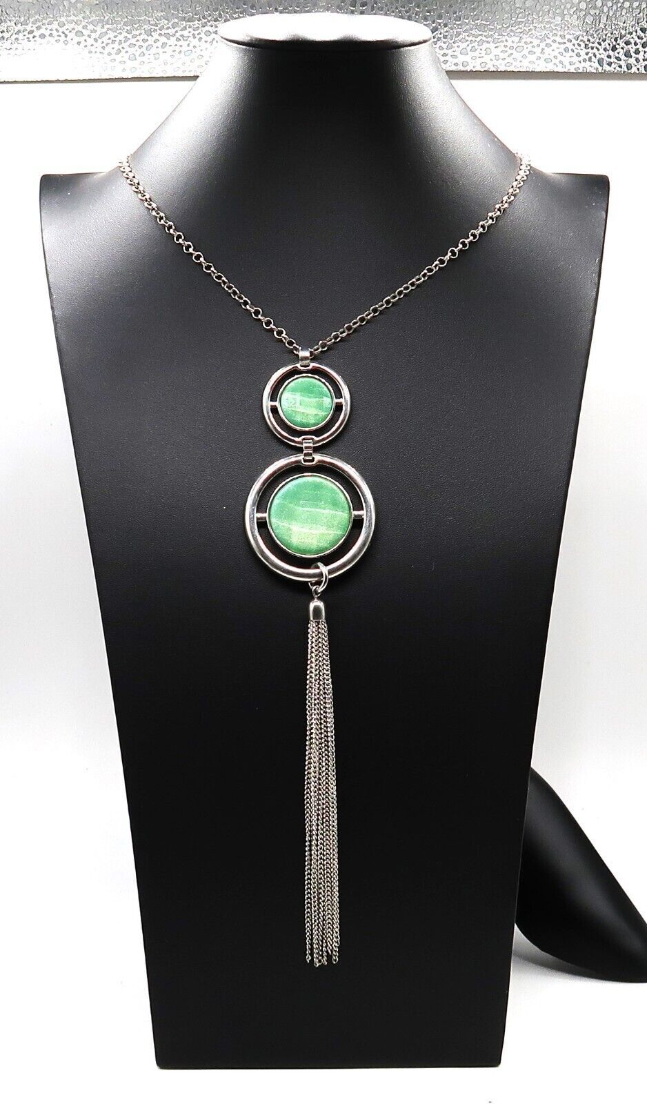 Vtg Silver Tone Elegant Dangle Statement Necklace w/ Two Green Pendant Unmarked