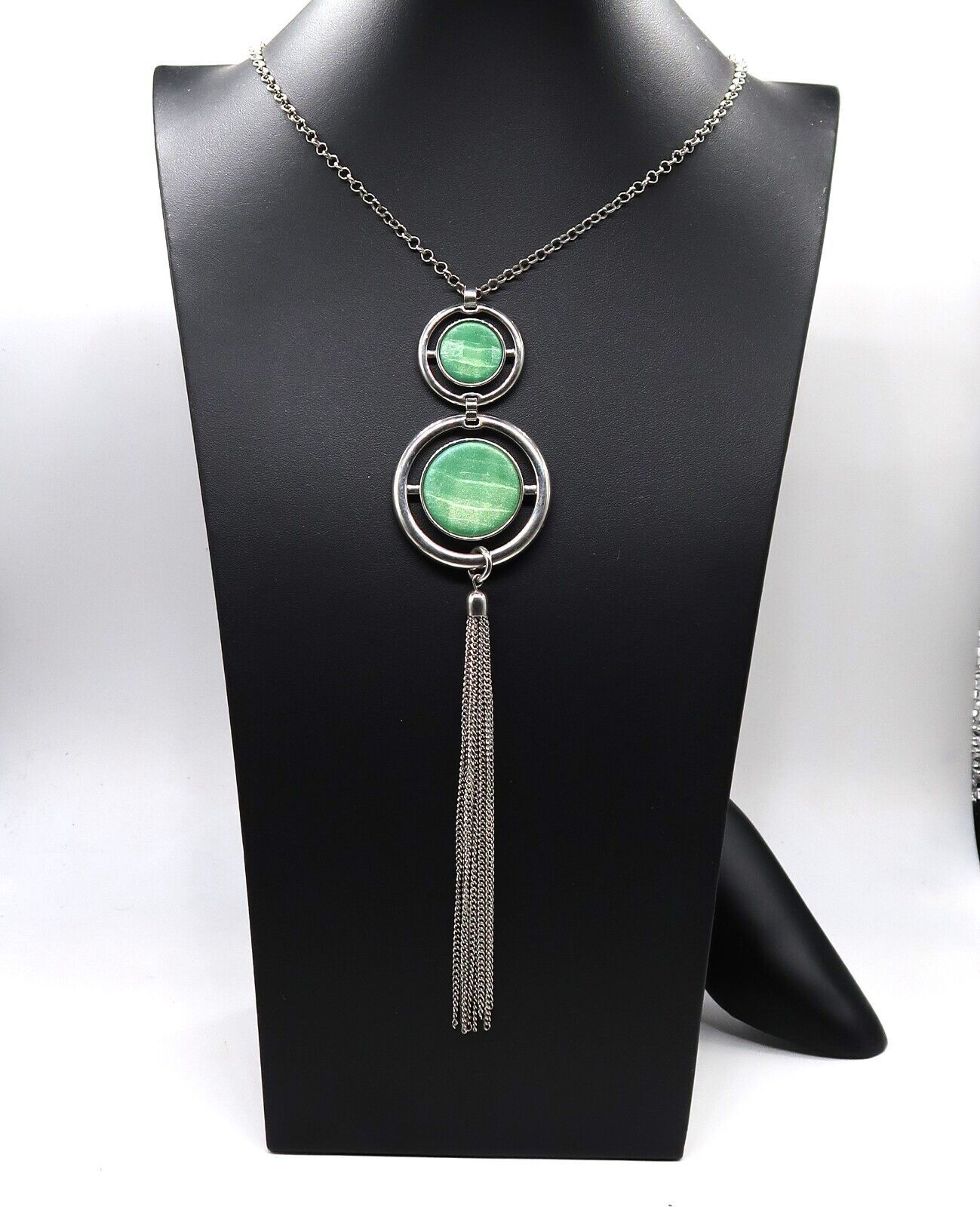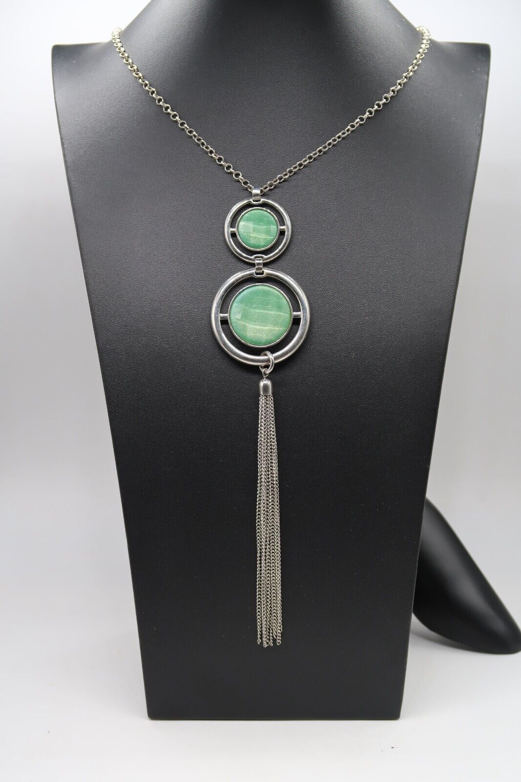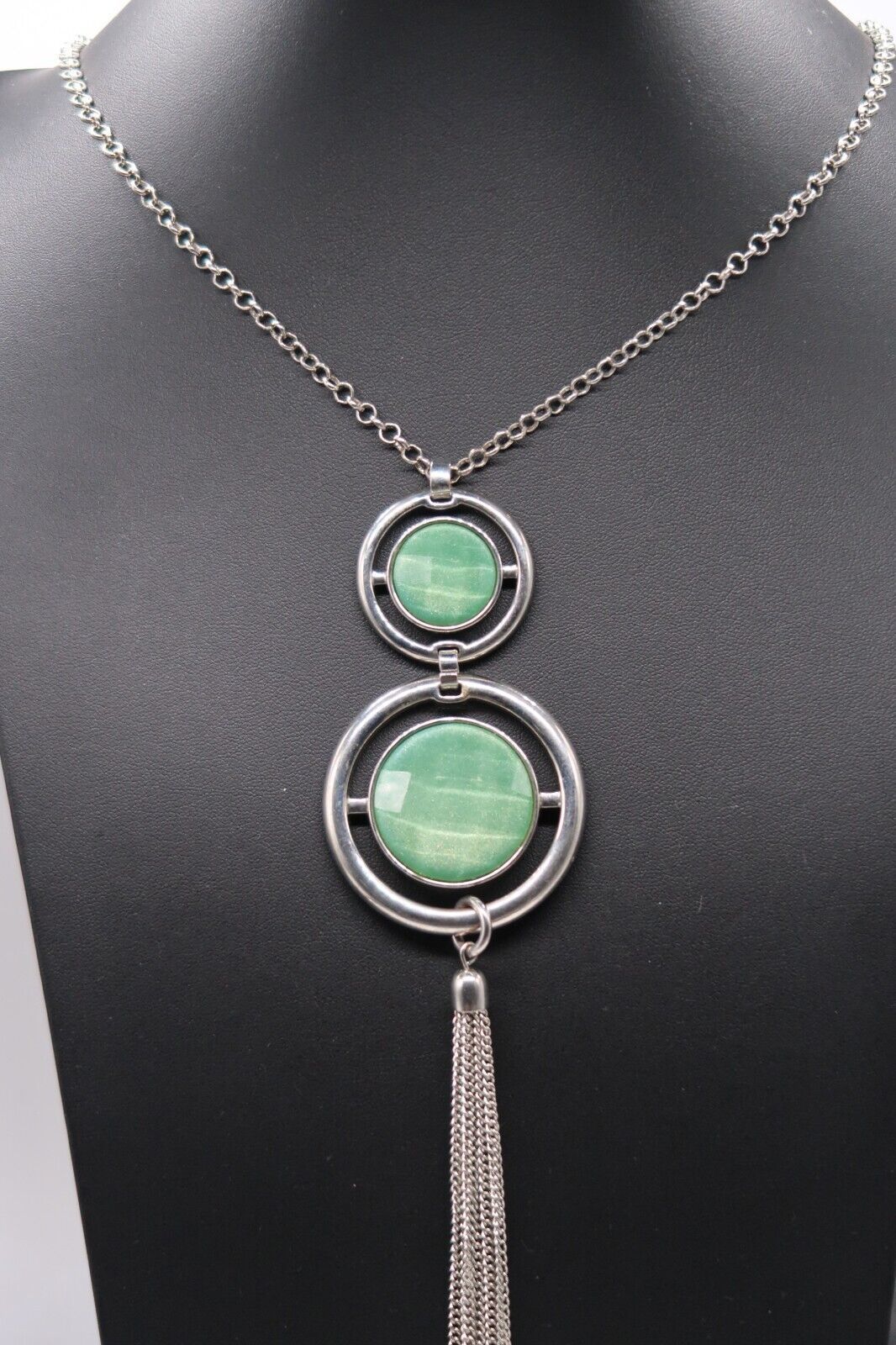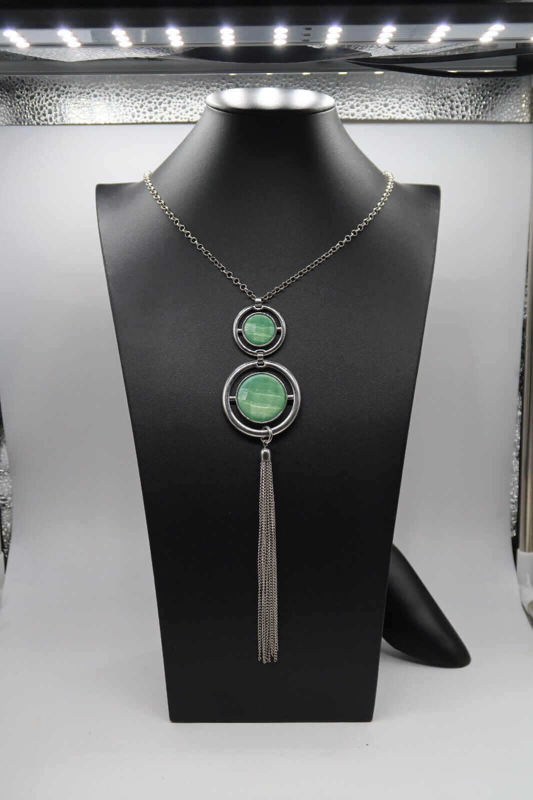 Vtg Silver Tone Elegant Dangle Statement Necklace w/ Two Green Pendant Unmarked
