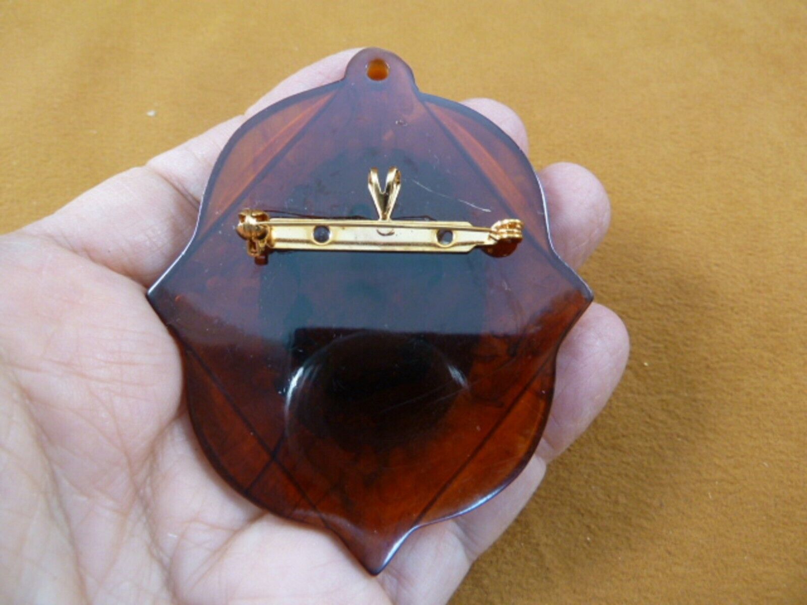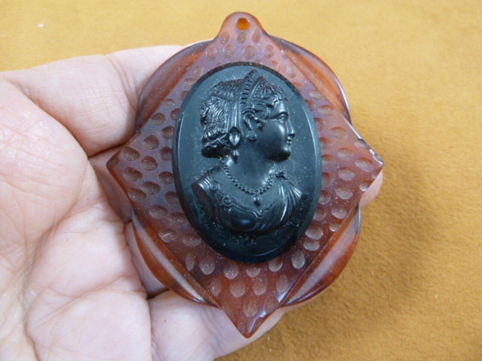 (Internal #C-1560) Excellent, vintage large black glass cameo, 45x33 mm, on original amber diamond textured glass with oval edging; hole on top for chain; 3" tall x 2-1/2" wide; new clasp pin/pendant glued on back.