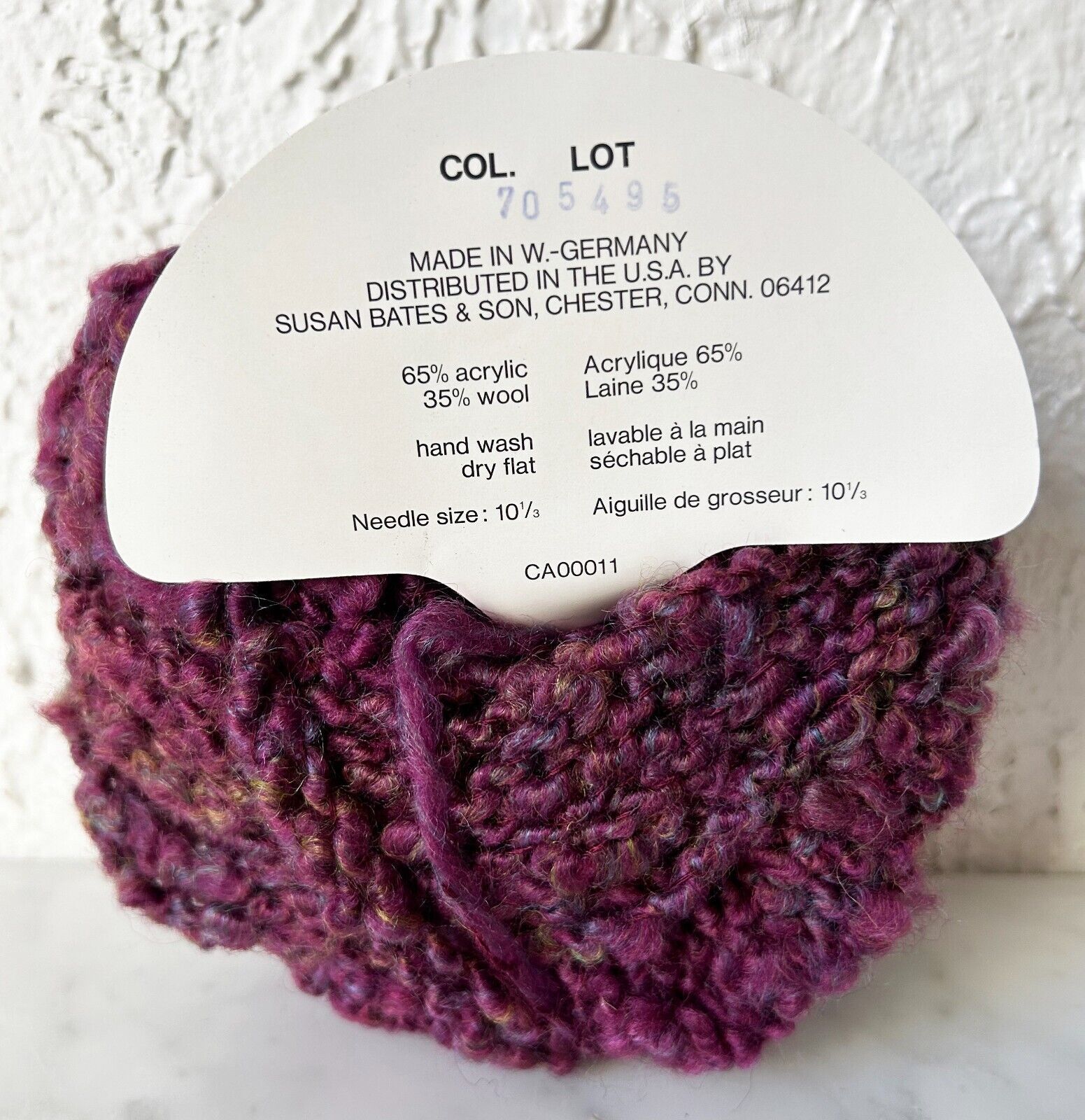 Vintage Jaeger Contessa boucle yarn. One skein, color Variegated Purple #70. 65% acrylic, 35% wool. Hand wash, dry flat. Made in W Germany. Distributed in the USA by Susan Bates Son.